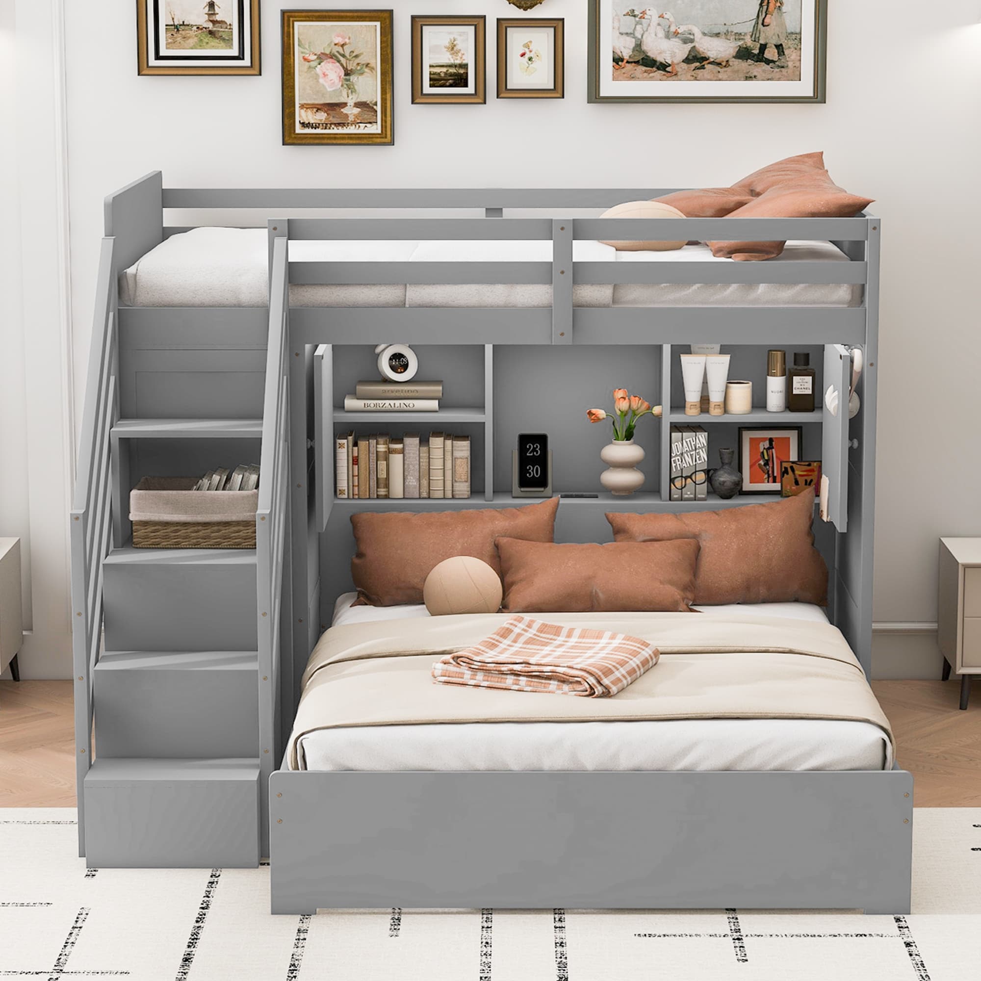 Twin Over Full Bunk Bed with Storage Stairs, Wardrobe & USB Ports