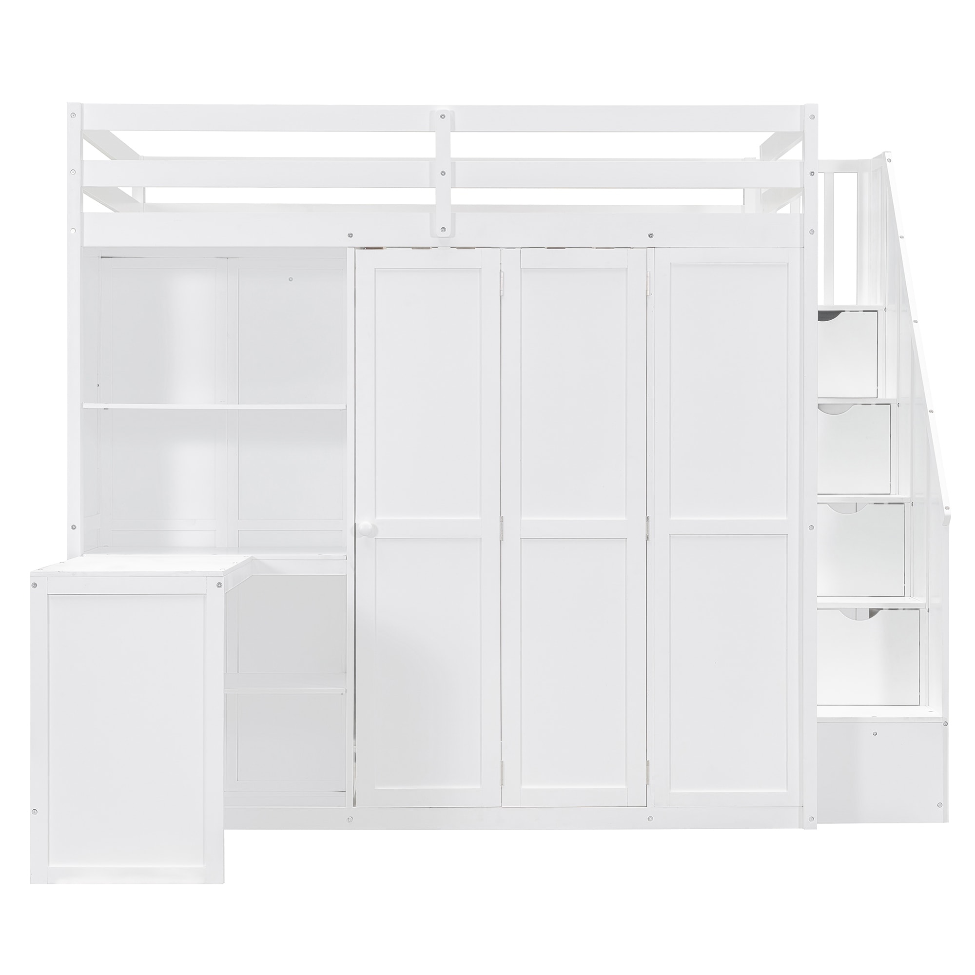 Full Size Loft Bed with Wardrobe,Desk and Shelves