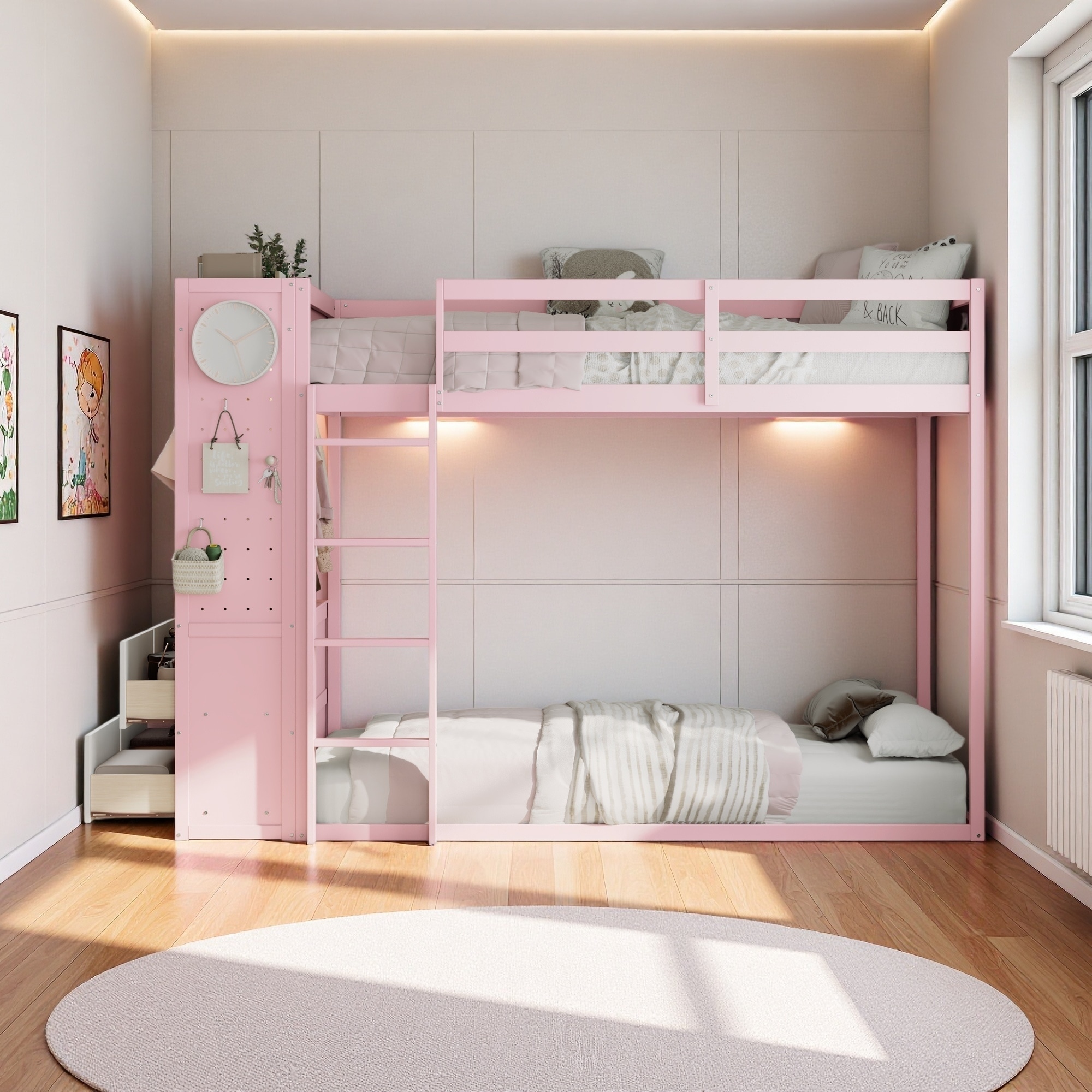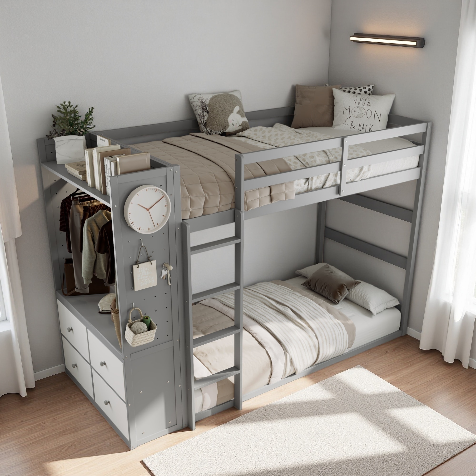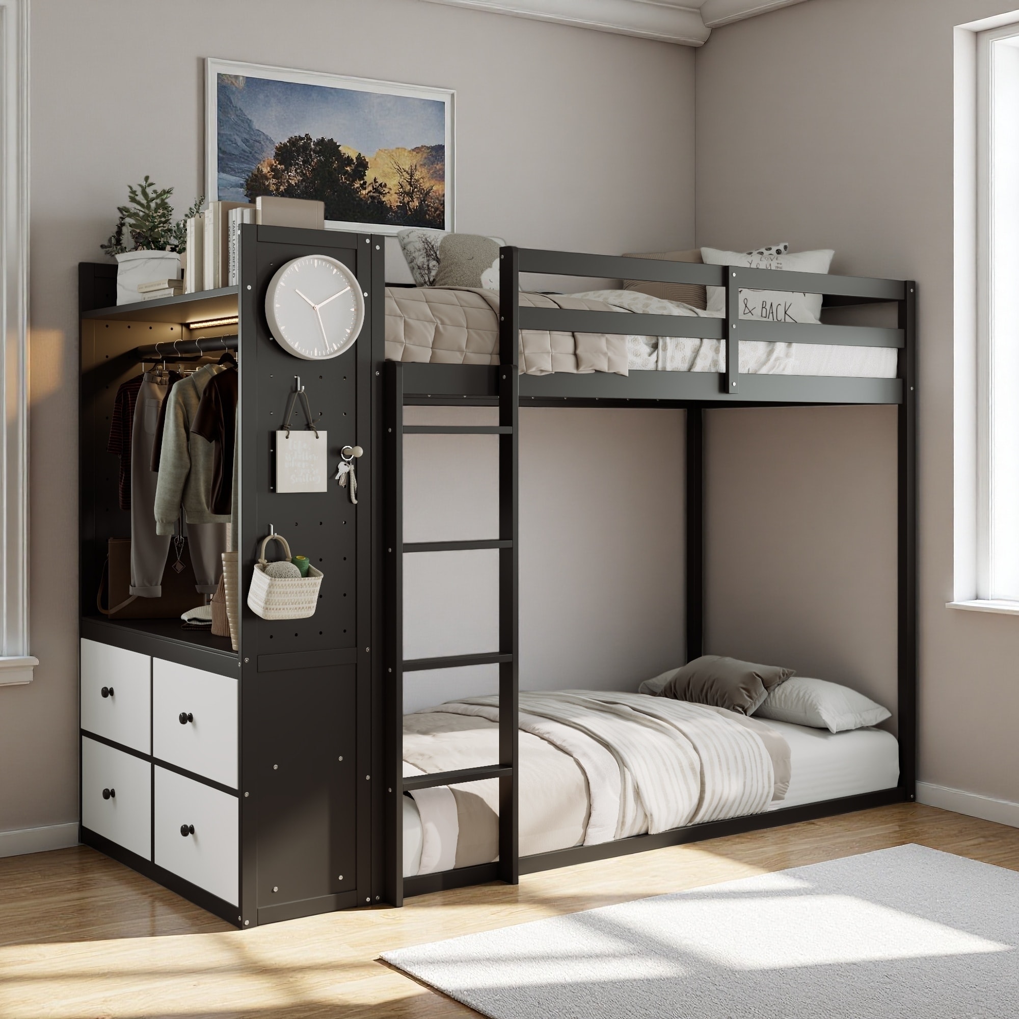 Twin Size Bunk Bed with 4 Storage Drawers, Hanging Rail, Light Strip, Built-in Shelves & Dual Pegboards, Pine & MDF