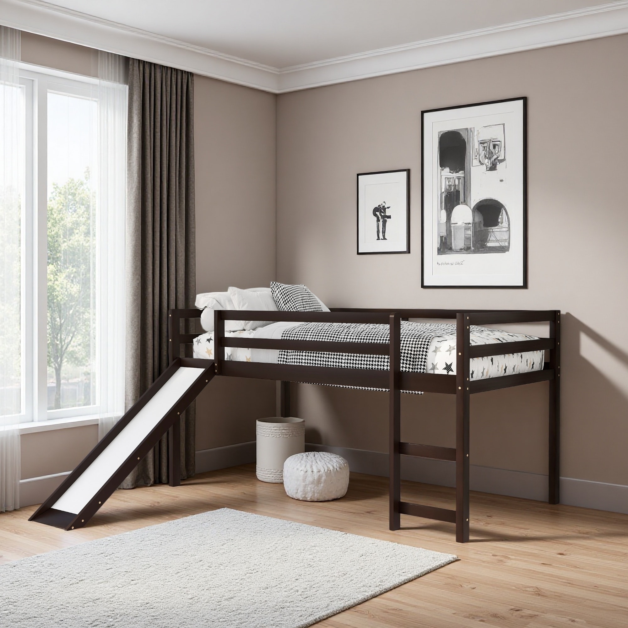 Espresso Wood Junior Loft Bed with Stairs for Adults, Kids and Young Teens