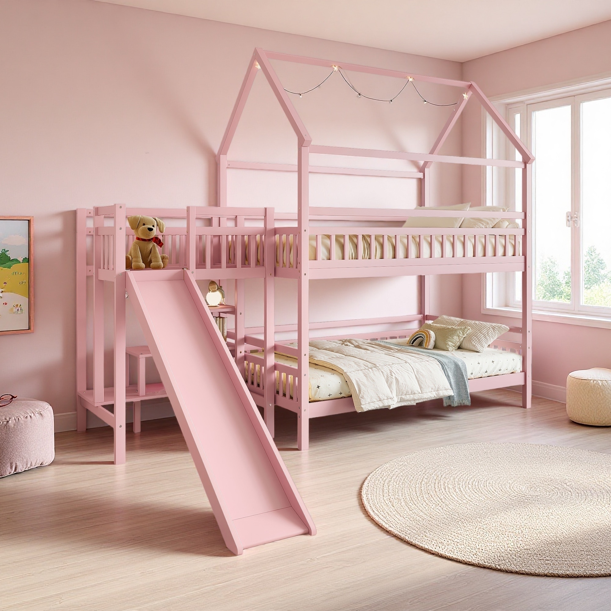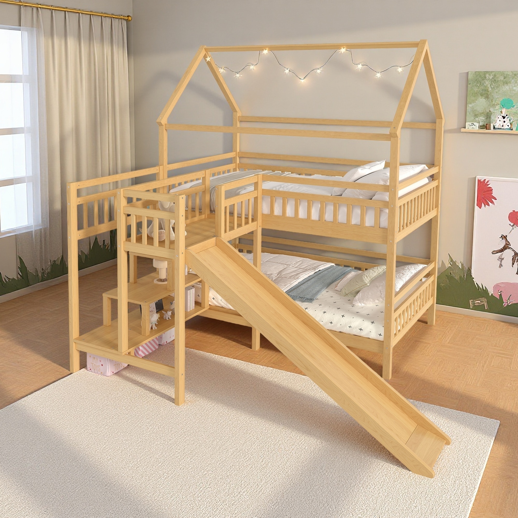 Full Size House-Shaped Bunk Bed with Slide, Pine Playhouse Bed with Storage Stairs, Two Layout Options, Noise-Free Design