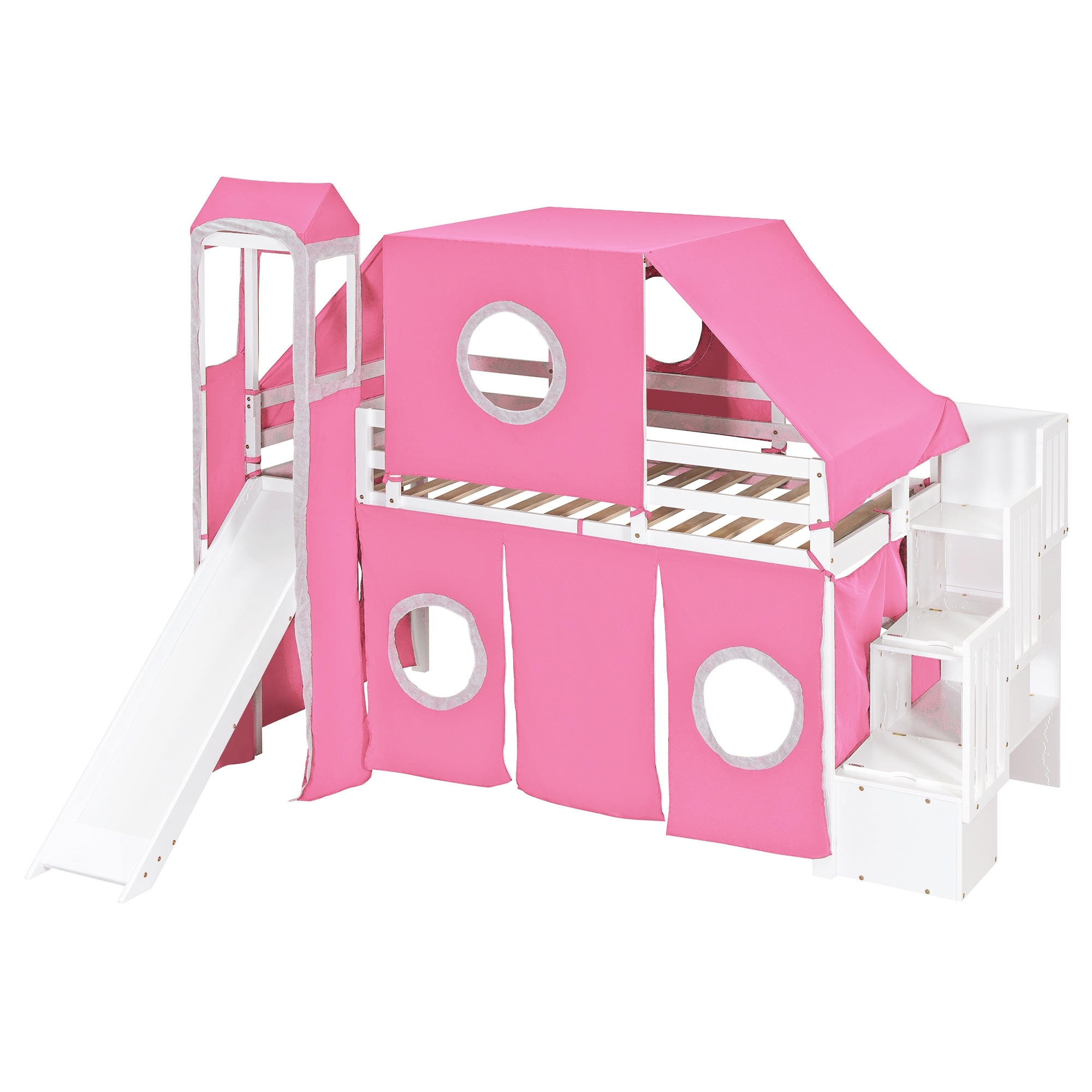 Twin Size Low Loft Bed with Slide, Storage Stairs, Tent & Tower