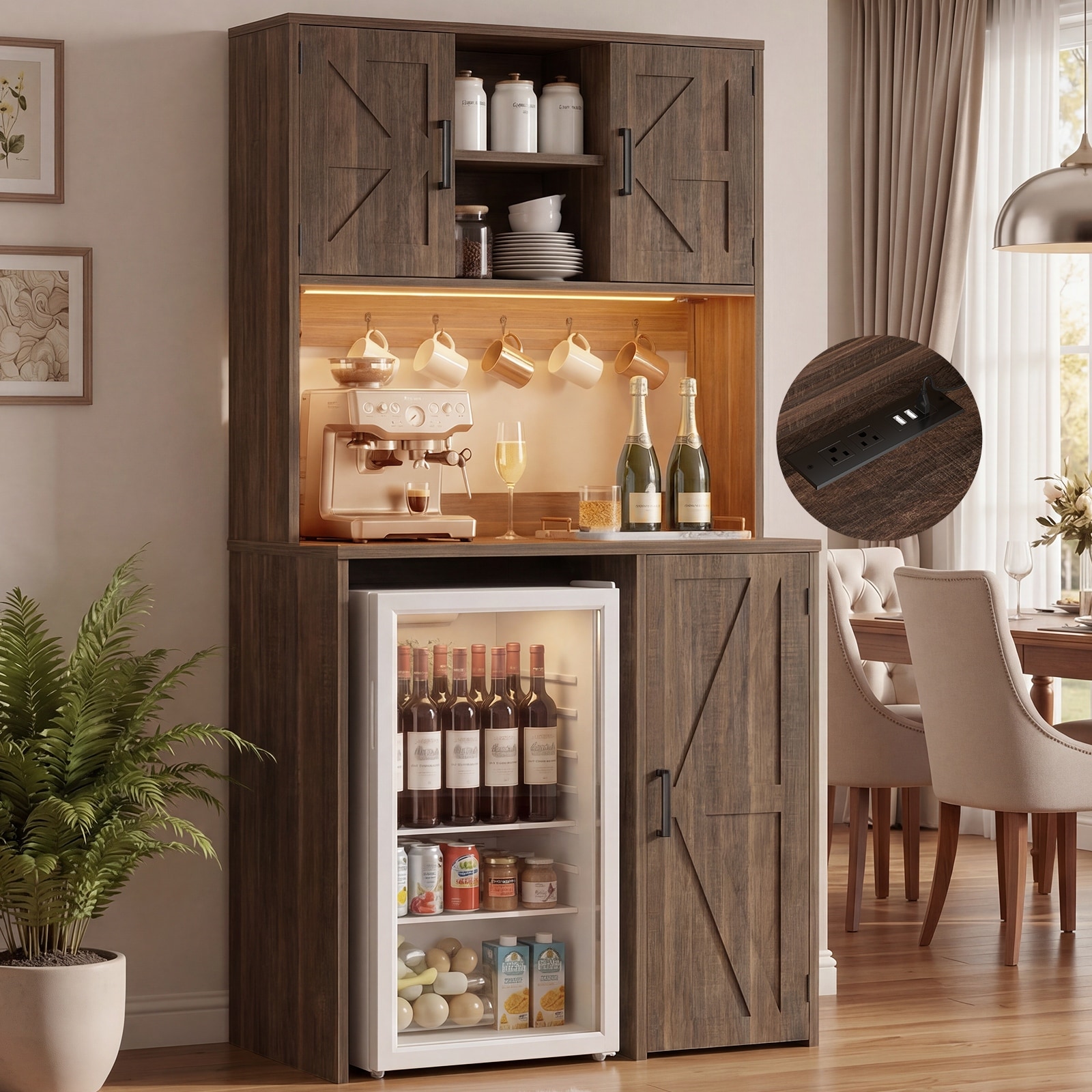35.5"W Farmhouse Bar Cabinet with Charging Station, Kitchen Pantry with LED Lighting & Mini Fridge Space