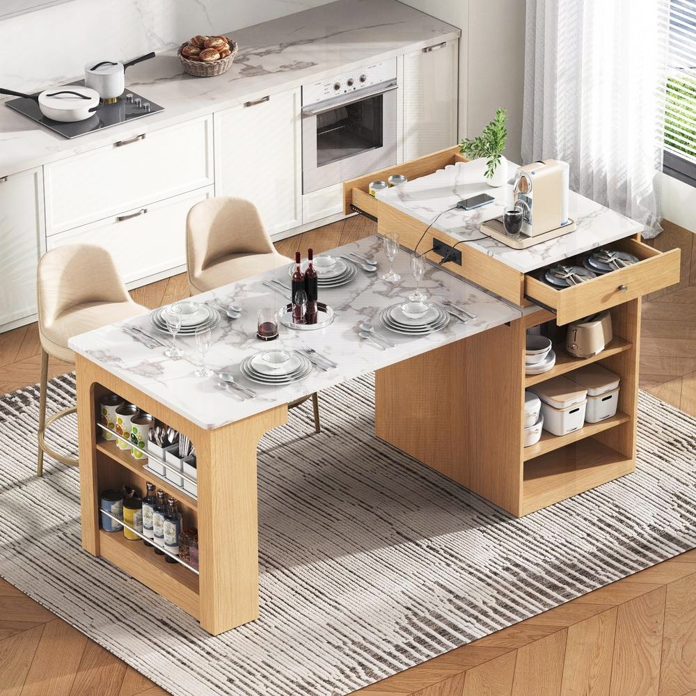 Extendable Kitchen Island with Hidden Pull-Out Counter, Power Outlets, USB Ports, Drawers, Open Shelves for Kitchen, Dining Room