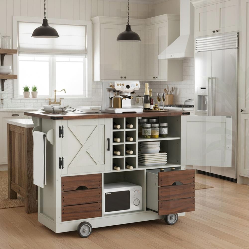 54 In Farmhouse Kitchen Island with Drop Leaf Power and Storage White