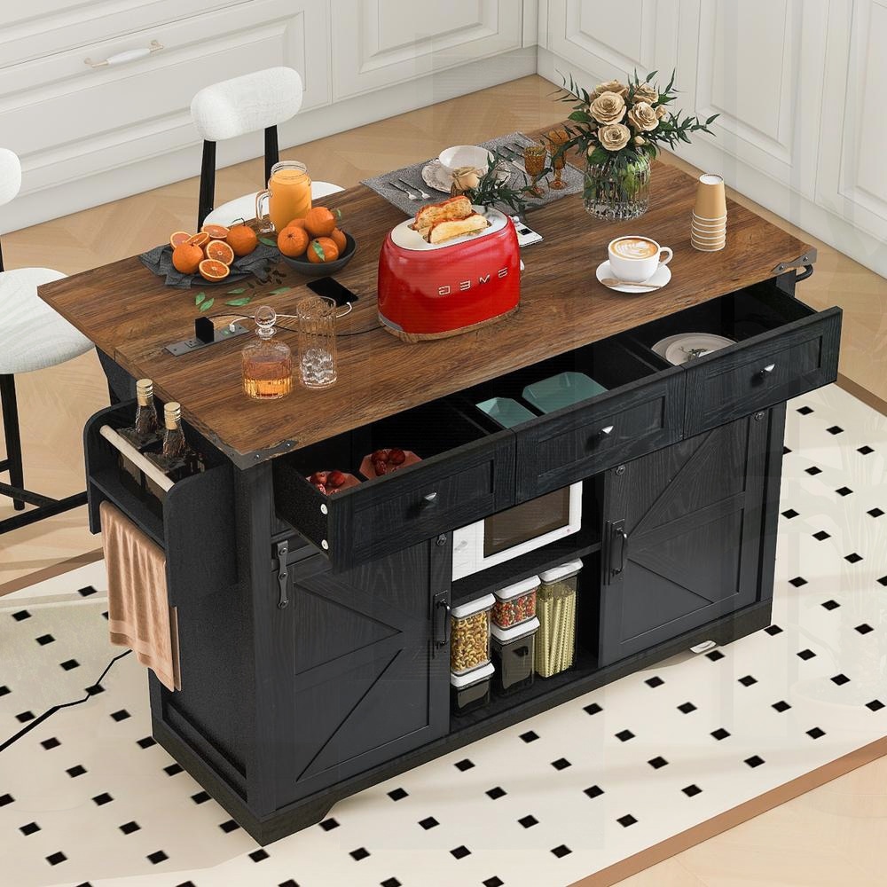 53.7 In Farmhouse Kitchen Island with Drop Leaf Barn Doors Power Black