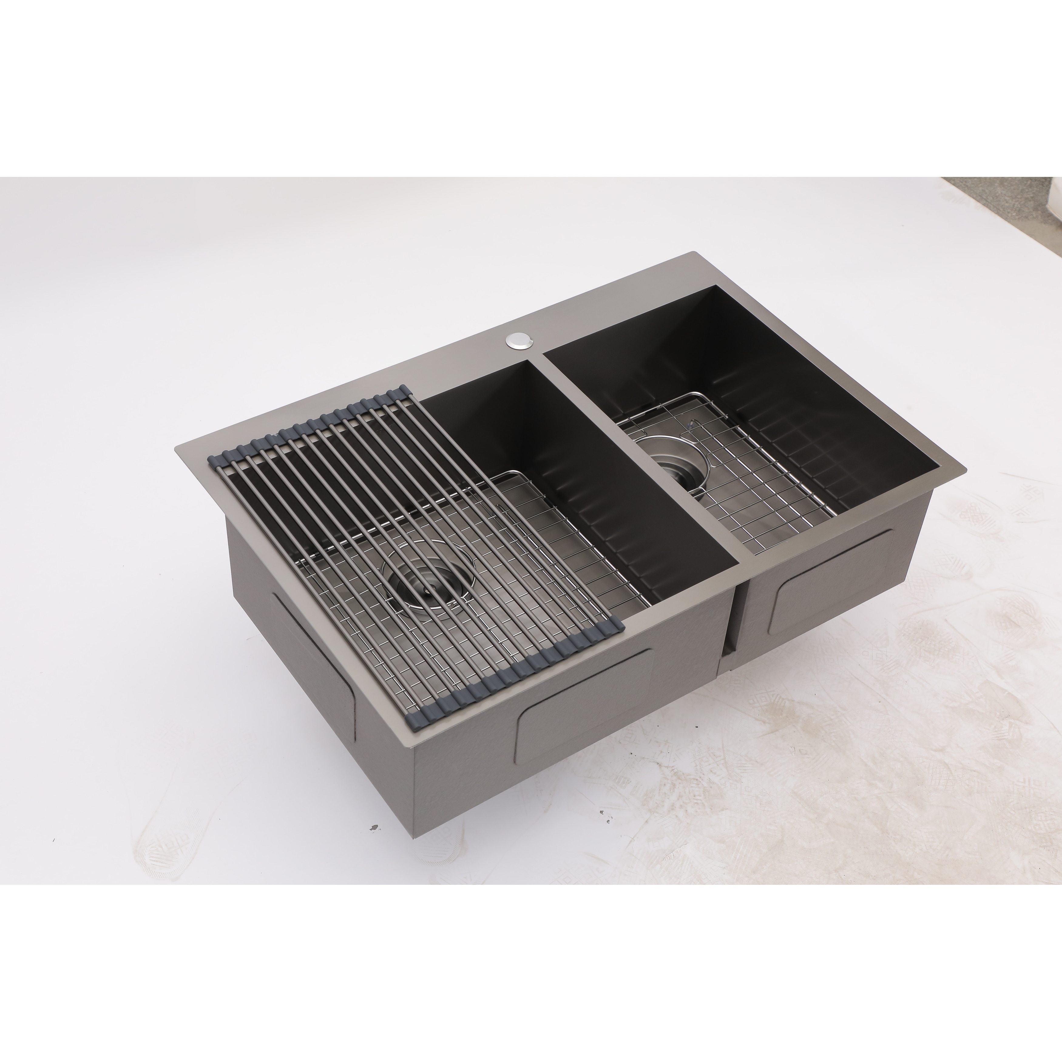 Double Bowl Drop in Sink- 33" x 22" x 9" Gunmetal Black Double Bowl Kitchen Sink 16 Gauge with Two 9" Deep Basin