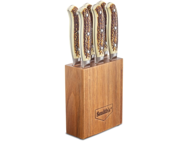 Smith's Sharpeners Cabin and Lodge Steak Set 9in Overall 4.5in Hammered Finish 420 SS Blade Imitation Stag Handle Storage Block Set Of Six 51033
