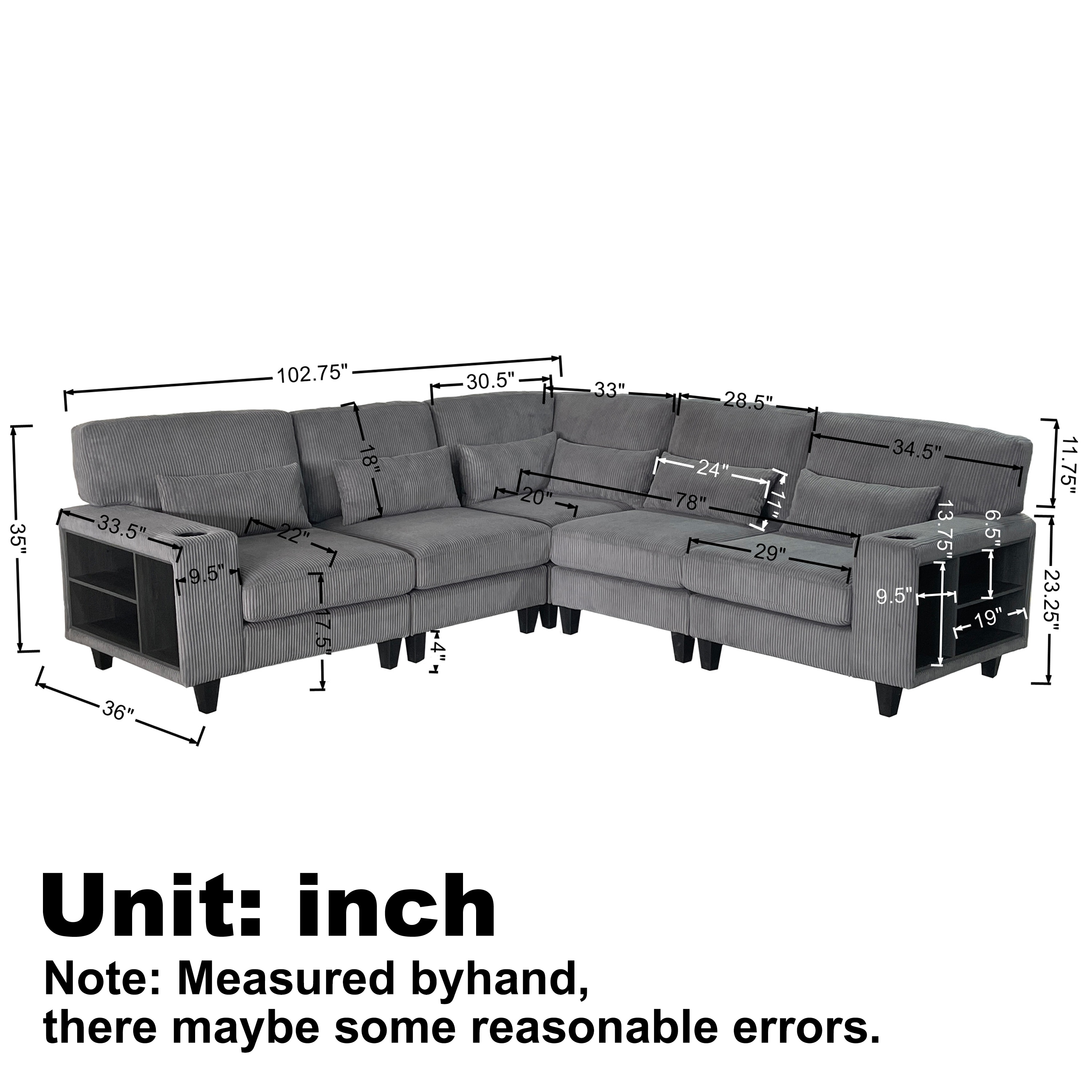 L Shaped Modular Sectional Sofa Modern Corduroy Arm Storage With Cup Holder