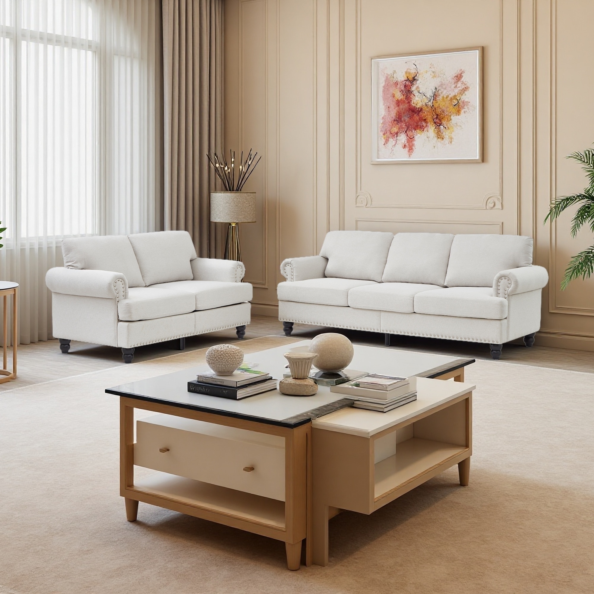 Polyester Fabric 5-Seater Sofa Set with Silver Nail Decor and Built-in Storage