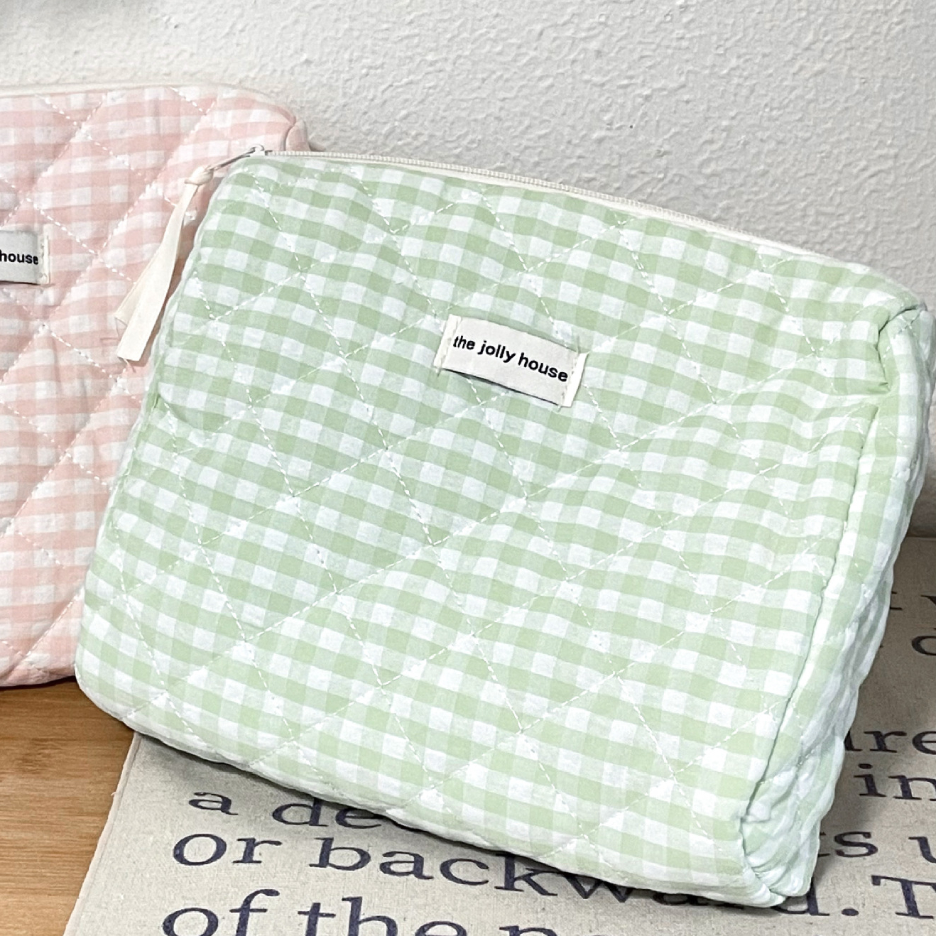 Retro Cherry Quilted Cotton Cosmetic Bag For Ladies, Travel Storage, Cute Pencil Case & Makeup Handbags For Women d Light Green