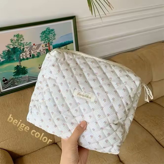 Floral Puffy Quilted Makeup Bag Large Travel Cosmetic Pouch With Storage Organizer, Perfect For Makeup Accessories blue