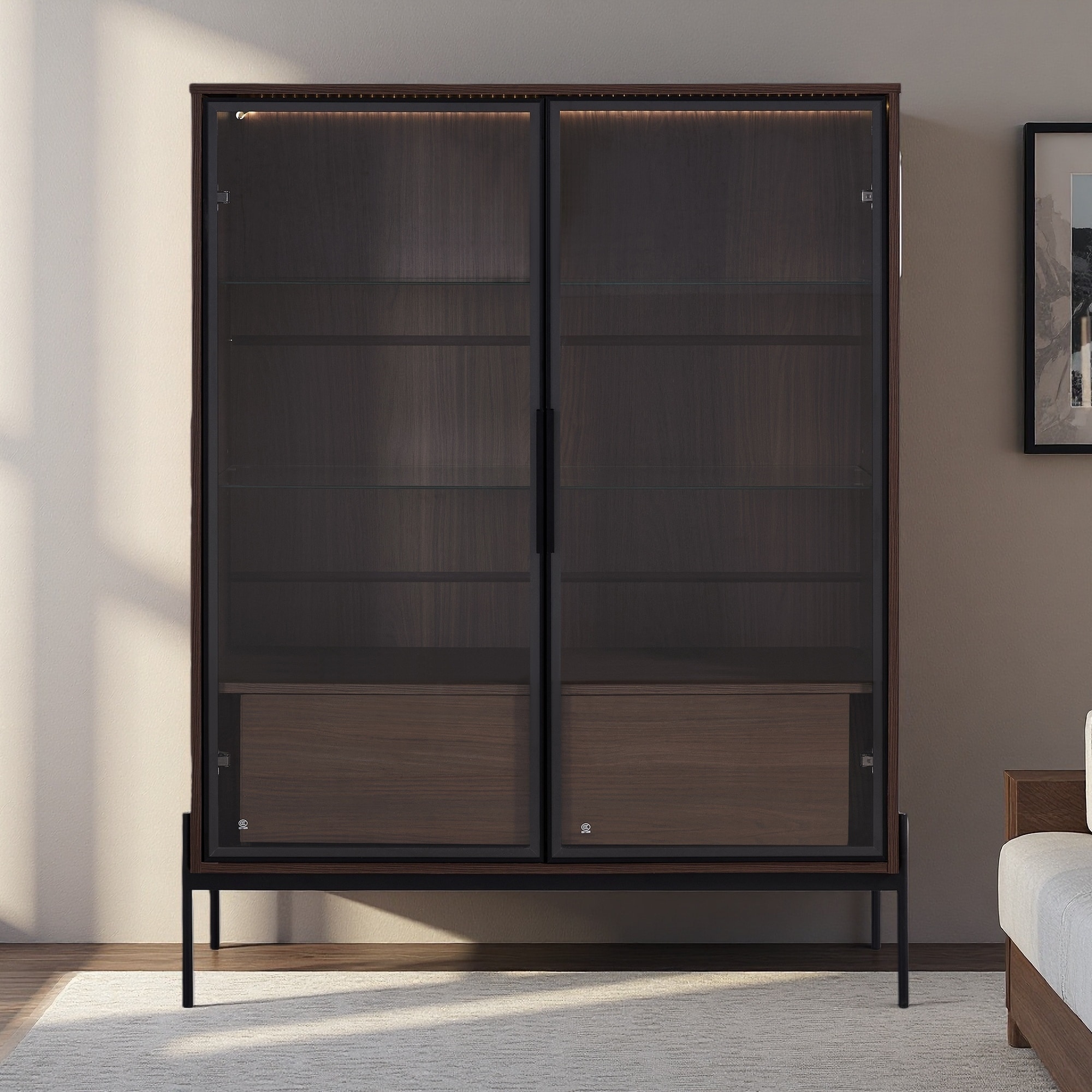 51.2"H Display Cabinet, 2 Drawers, Pantry, Glass Doors, LED, Adjustable Shelves