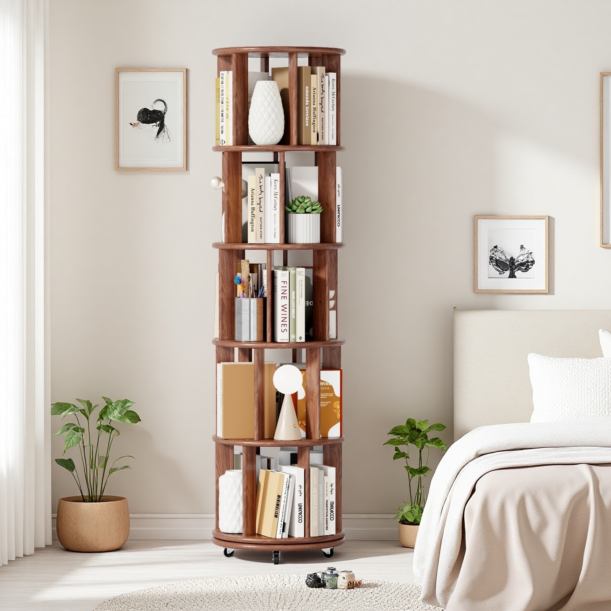 65"H Natural Rubberwood 5-Tier Rotating Bookshelf, 360° Spinning, Detachable