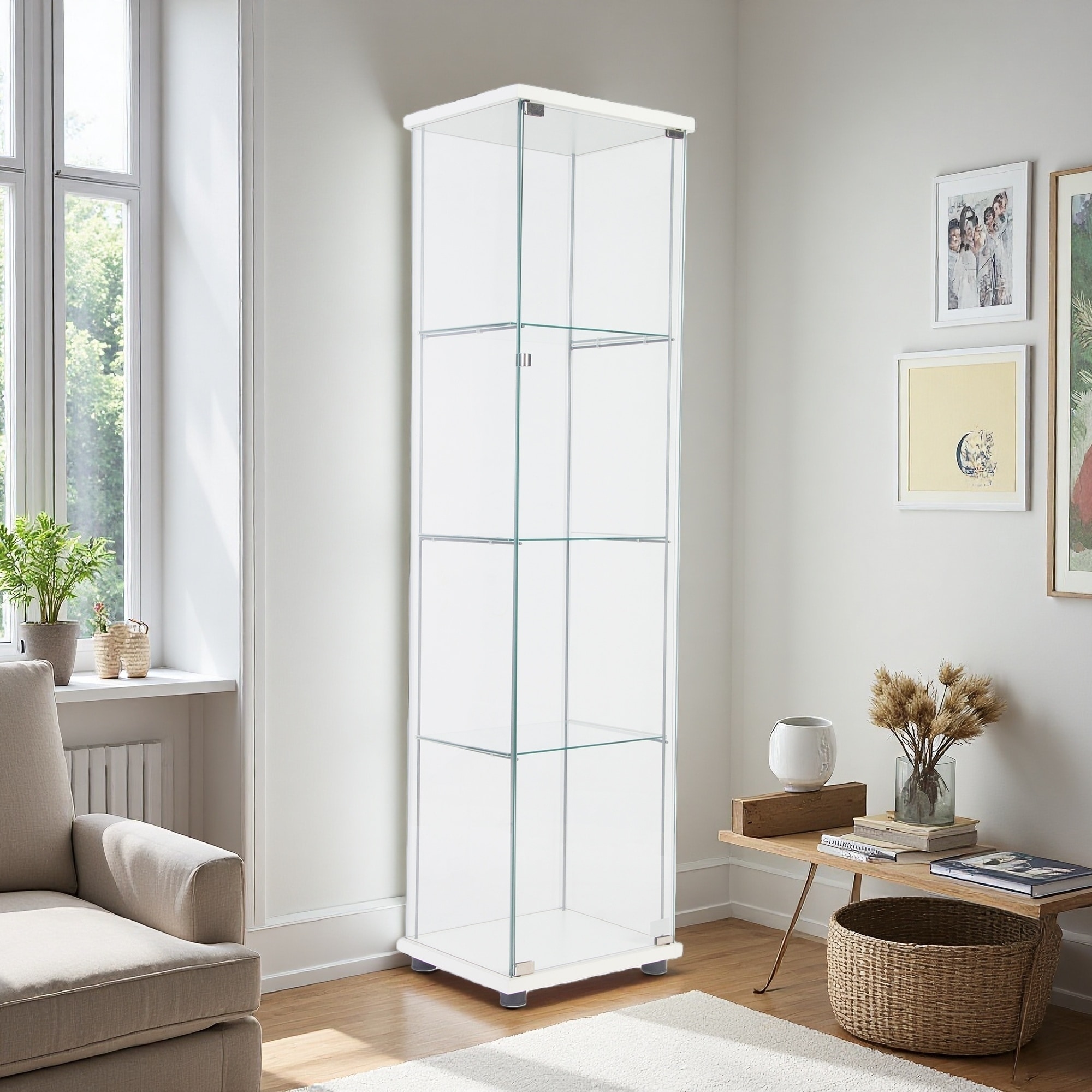 64"H Glass Display Cabinet, 1 Door, 4 Shelves, Tempered Glass & Wood