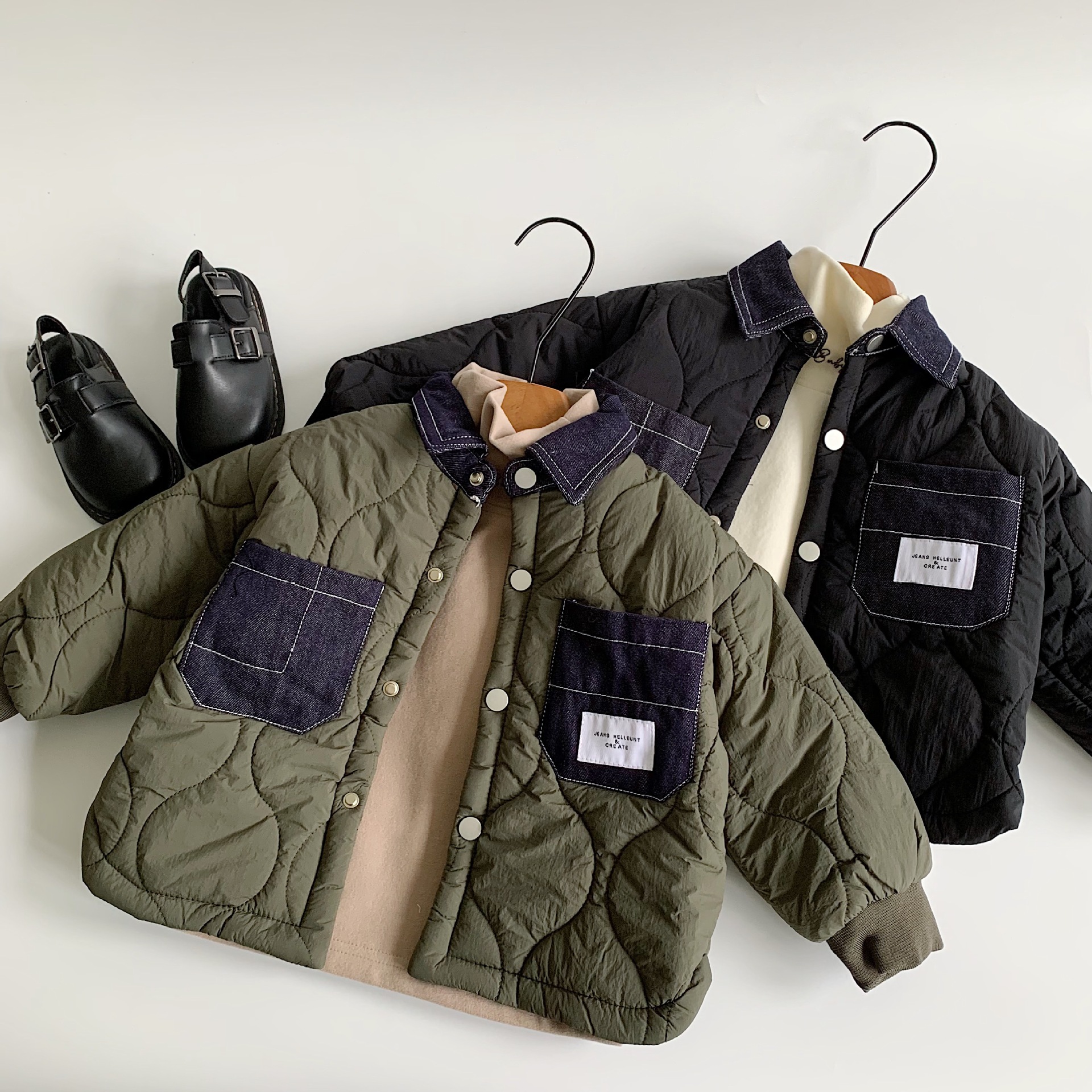 Winter Kids Jacket, Boys Denim Patchwork, Korean Style, Casual Cotton Padded Children Clothes, Thickened Coat army Green 120cm