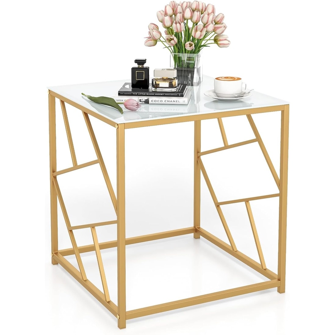 Modern Gold Side Table with Tempered Glass Top, Geometric Metal Frame, Ideal for Small Spaces, Bedroom or Living Room