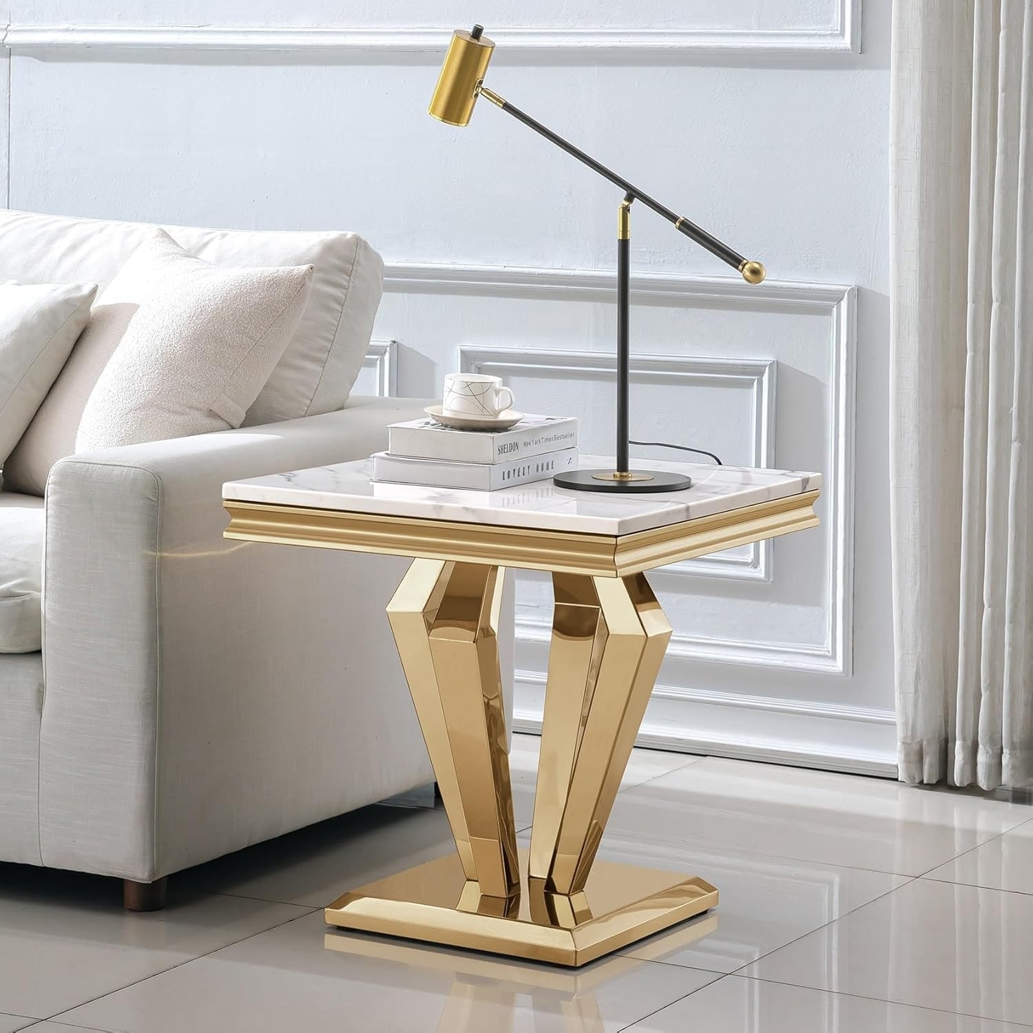 23'' Faux Marble Square End Table with Diamond Stainless Steel Base, White and Gold Accent Night Stand for Living Room