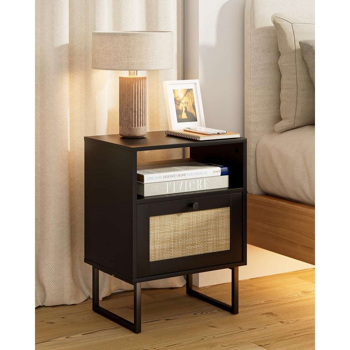 Modern Boho Nightstand with Rattan Drawer and Open Shelf, Black Wood Bedside Table for Bedroom or Living Room