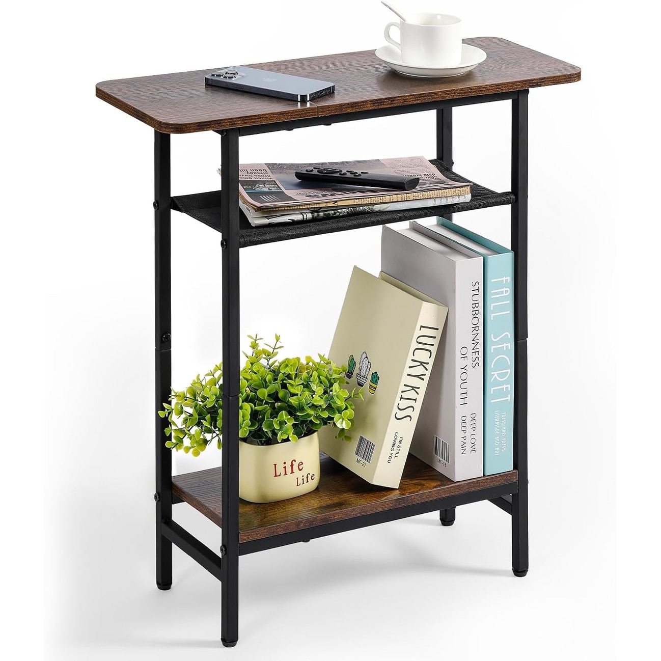 Compact 3-Tier Narrow Side Table with Wide Tabletop, Rustic Brown Nightstand for Small Spaces