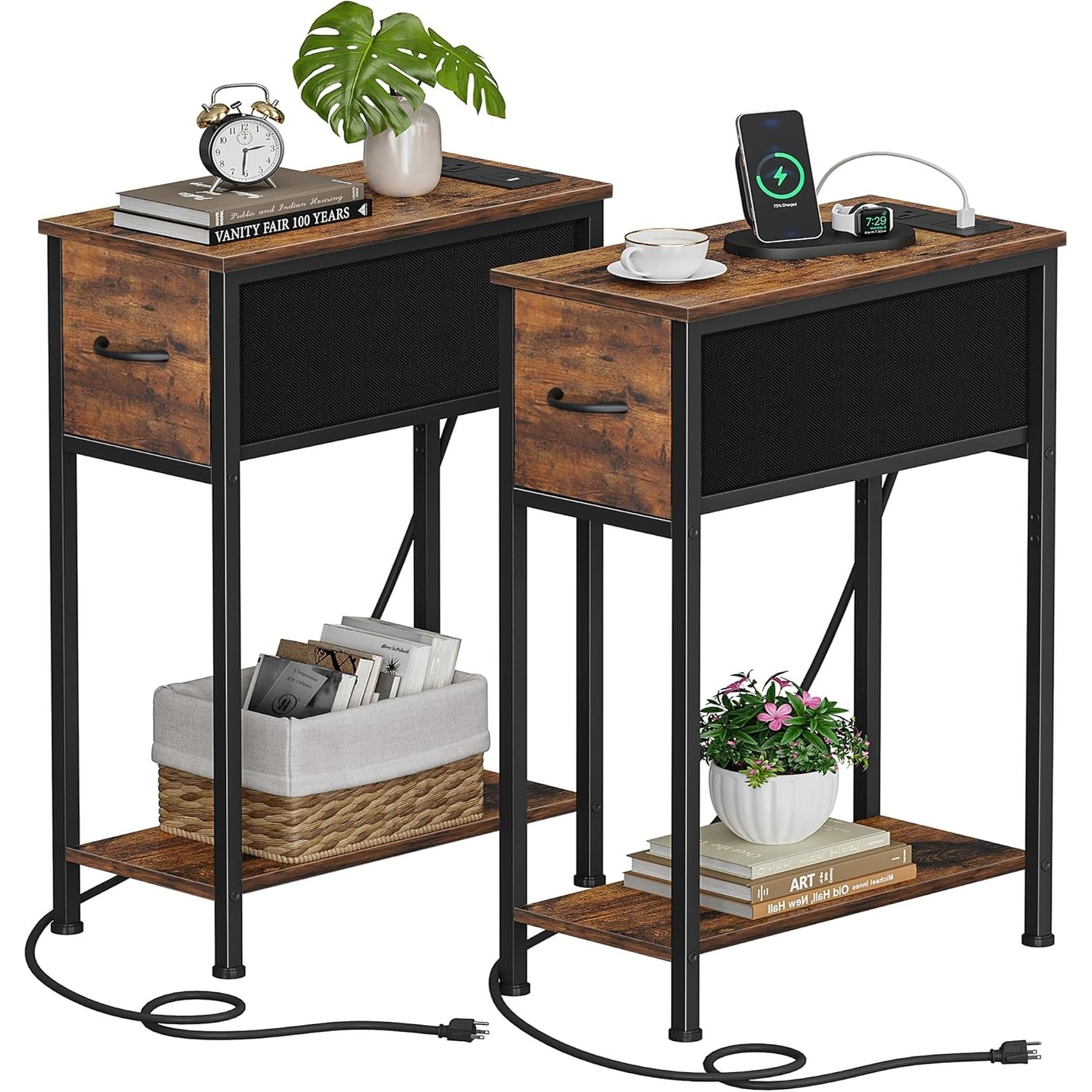 Compact End Table Set with Charging Station, Narrow Nightstand with Fabric Drawer, Versatile Side Table for Small Spaces