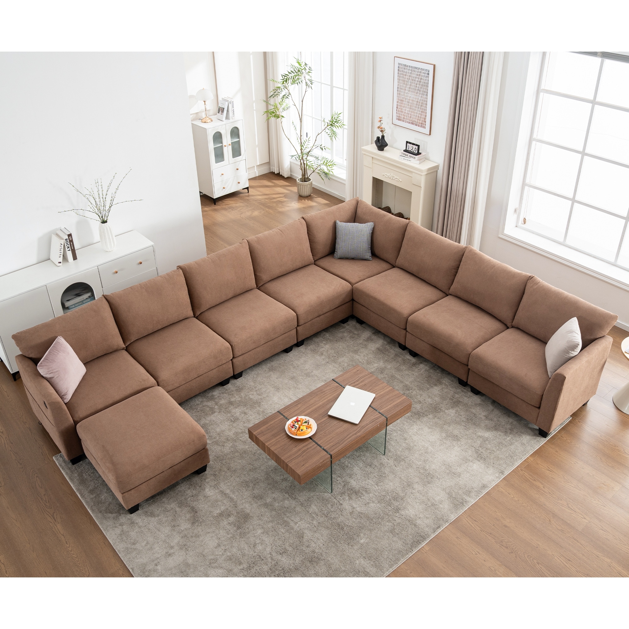 U-Shaped Sectional Sofa with Chaise Lounge, Oversized Corduroy Upholstered Sofa, 5 Seater Sofa with Removable Throw Pillows