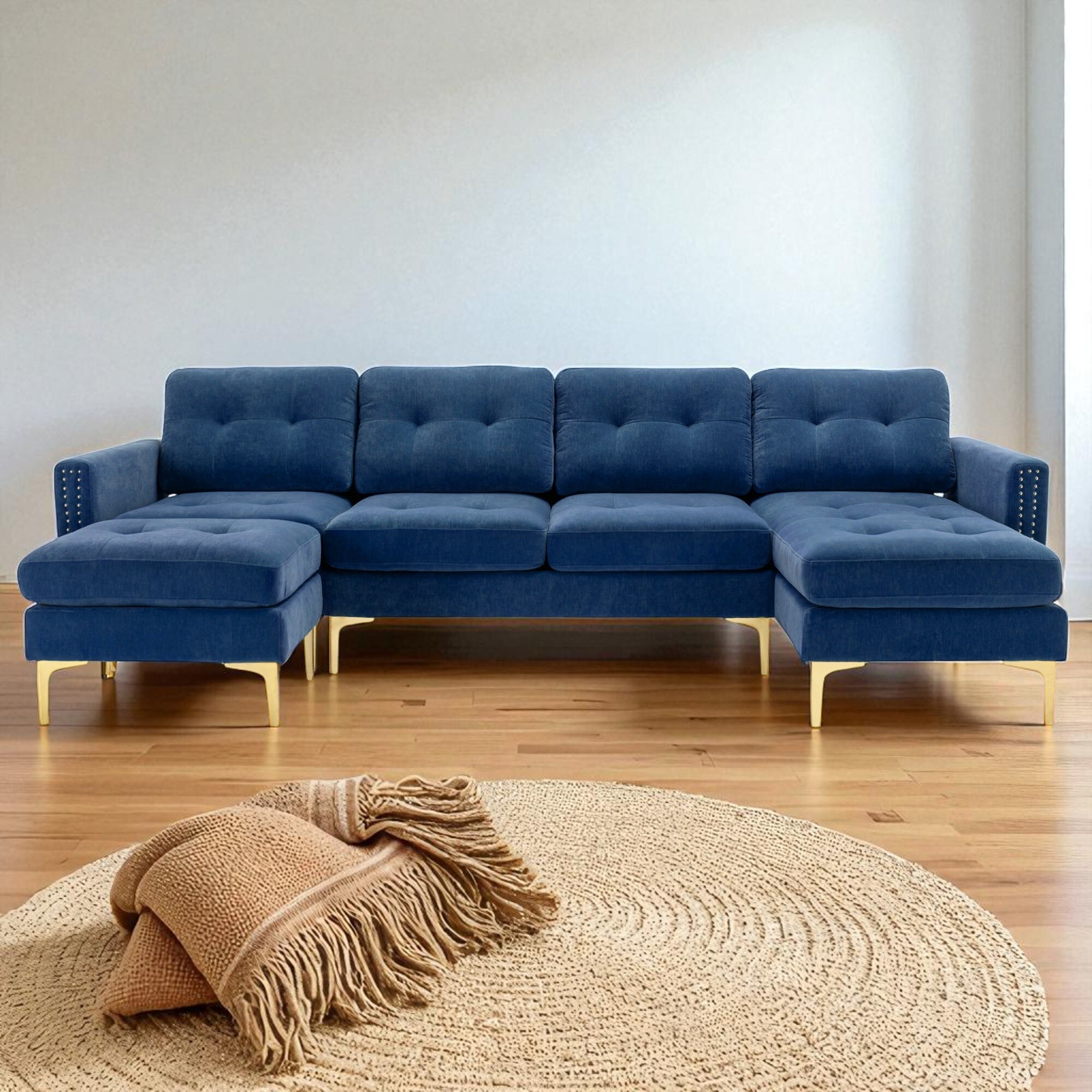 Velvet Sectional Sofa with Tufted Cushions, Movable Ottoman, Storage Pockets, and Nailhead Trim