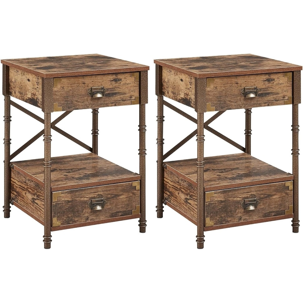 Vintage Solid Wood Nightstand Set of 2 with Storage Drawers and Open Shelf, X Design, Sturdy Metal Frame, Rustic Brown