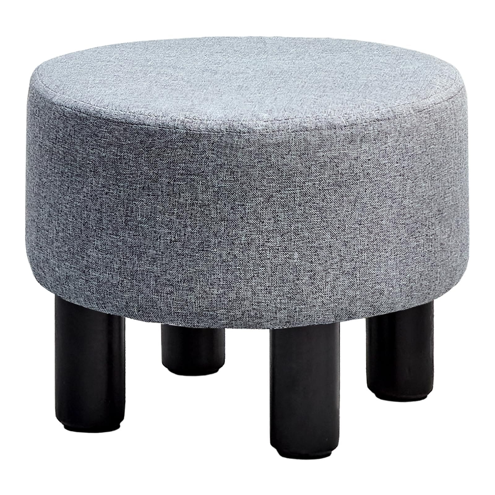 Modern Small Round Linen Ottoman Footstool with Wooden Legs for Bedroom or Living Room