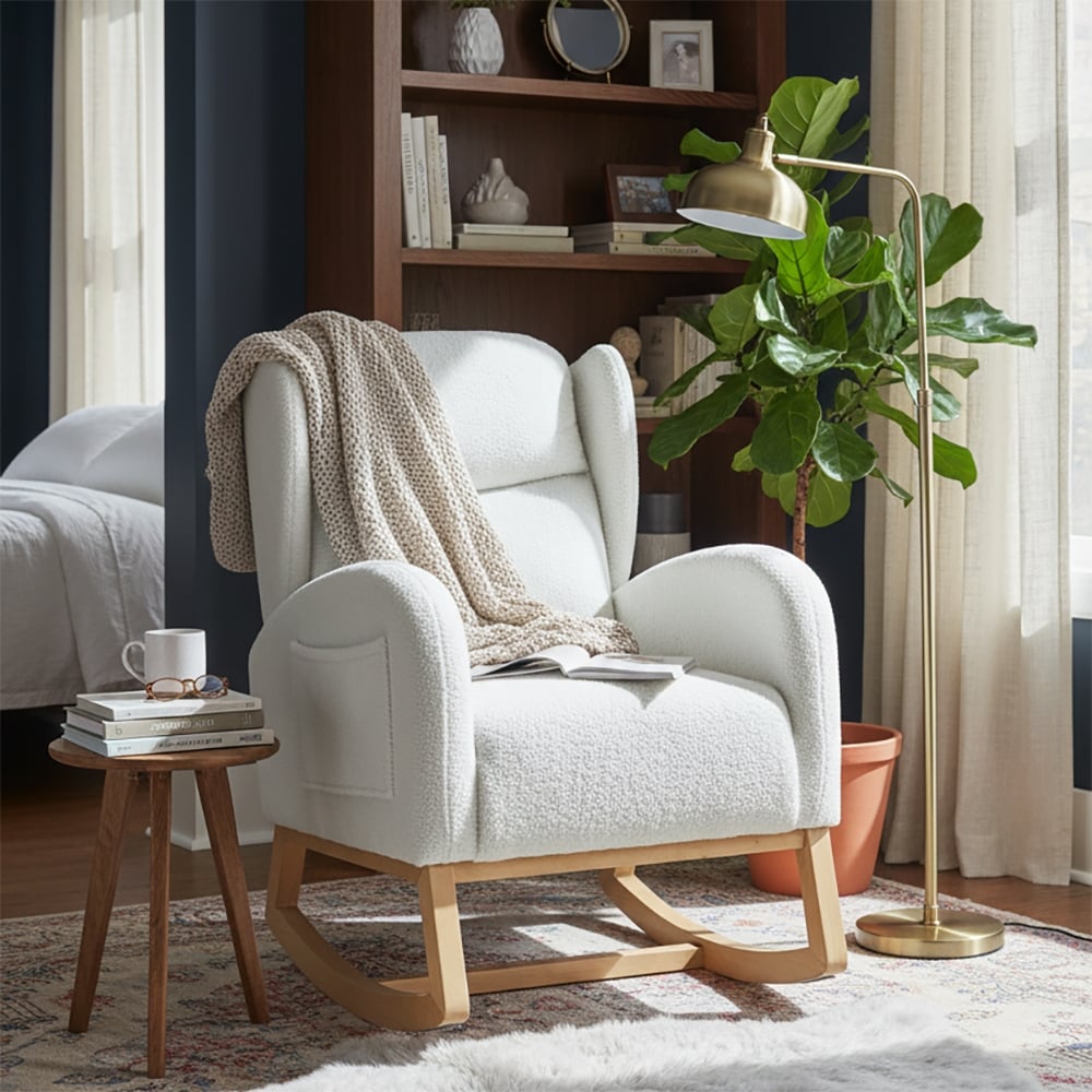 Classic Teddy Fabric Upholstered Wingback Rocking Chair with A Storage Pocket