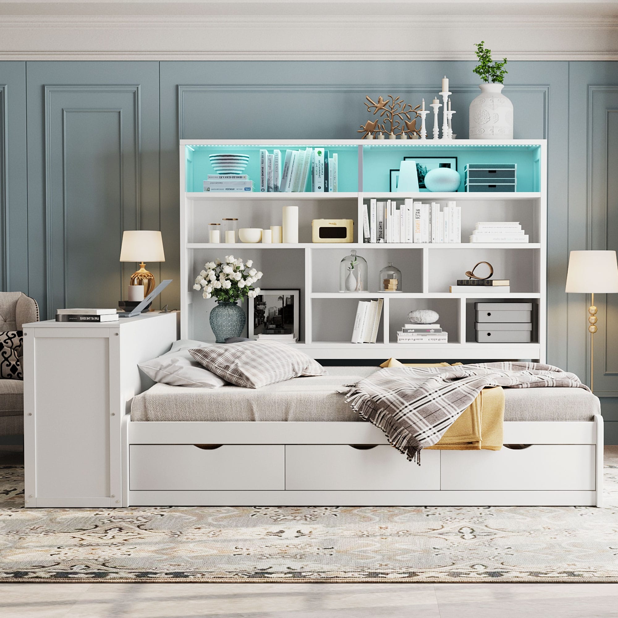 Full Size Wooden Daybed With Three Drawers ,Desk ,Shelves and Lights