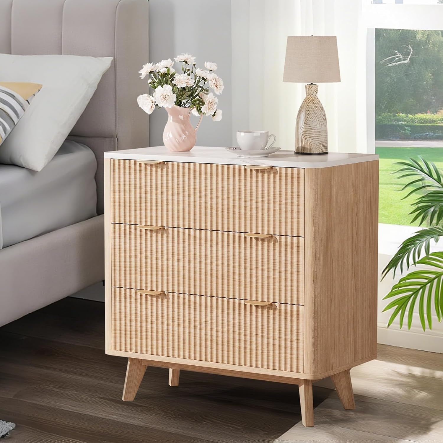 32" Fluted Nightstand, Modern 3 Drawer Bedside Table with Faux Marble Top