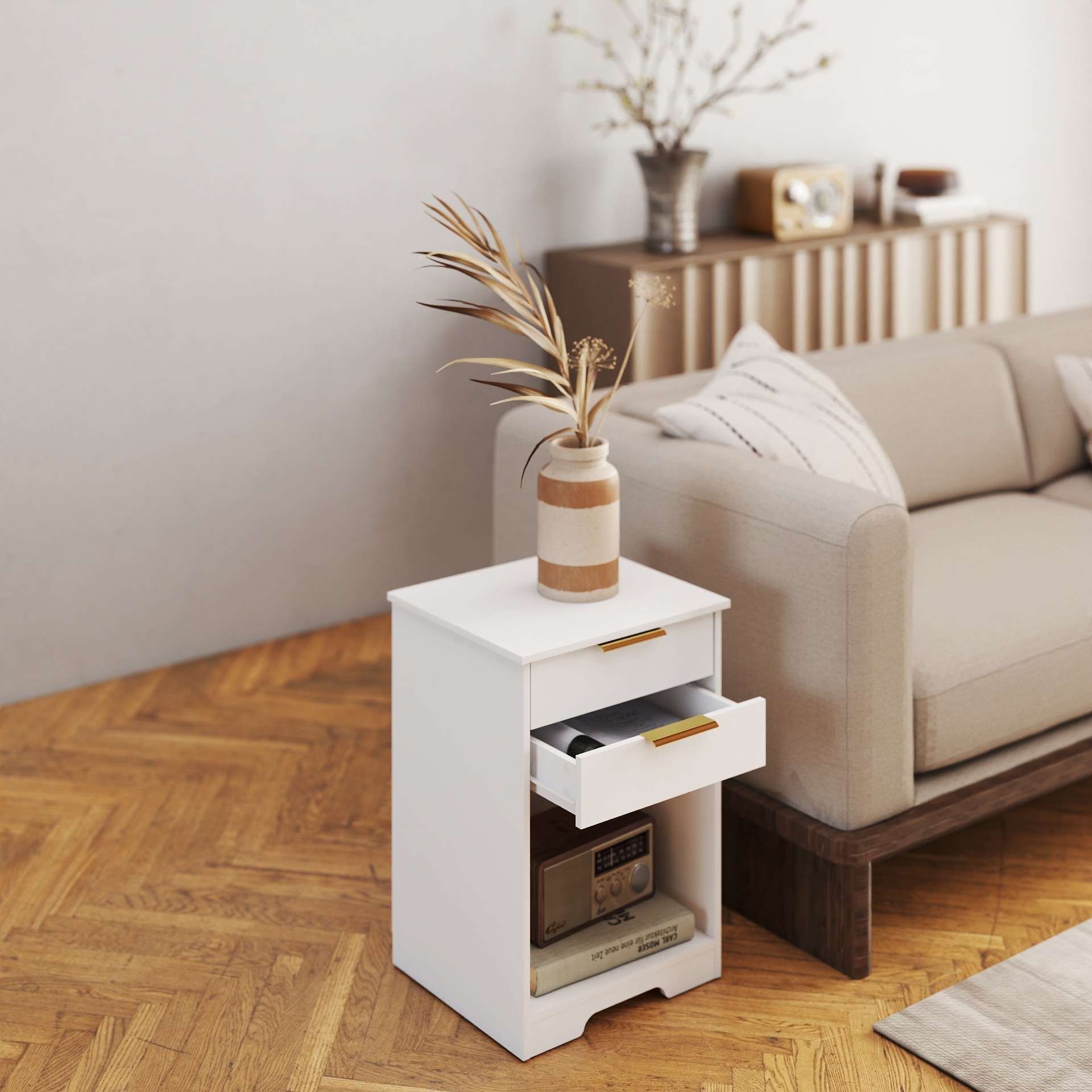 Modern Nightstand with 2 Drawers, End Table with Open Storage Space, Featuring Golden Handles, Easy to Assemble, White Finish.