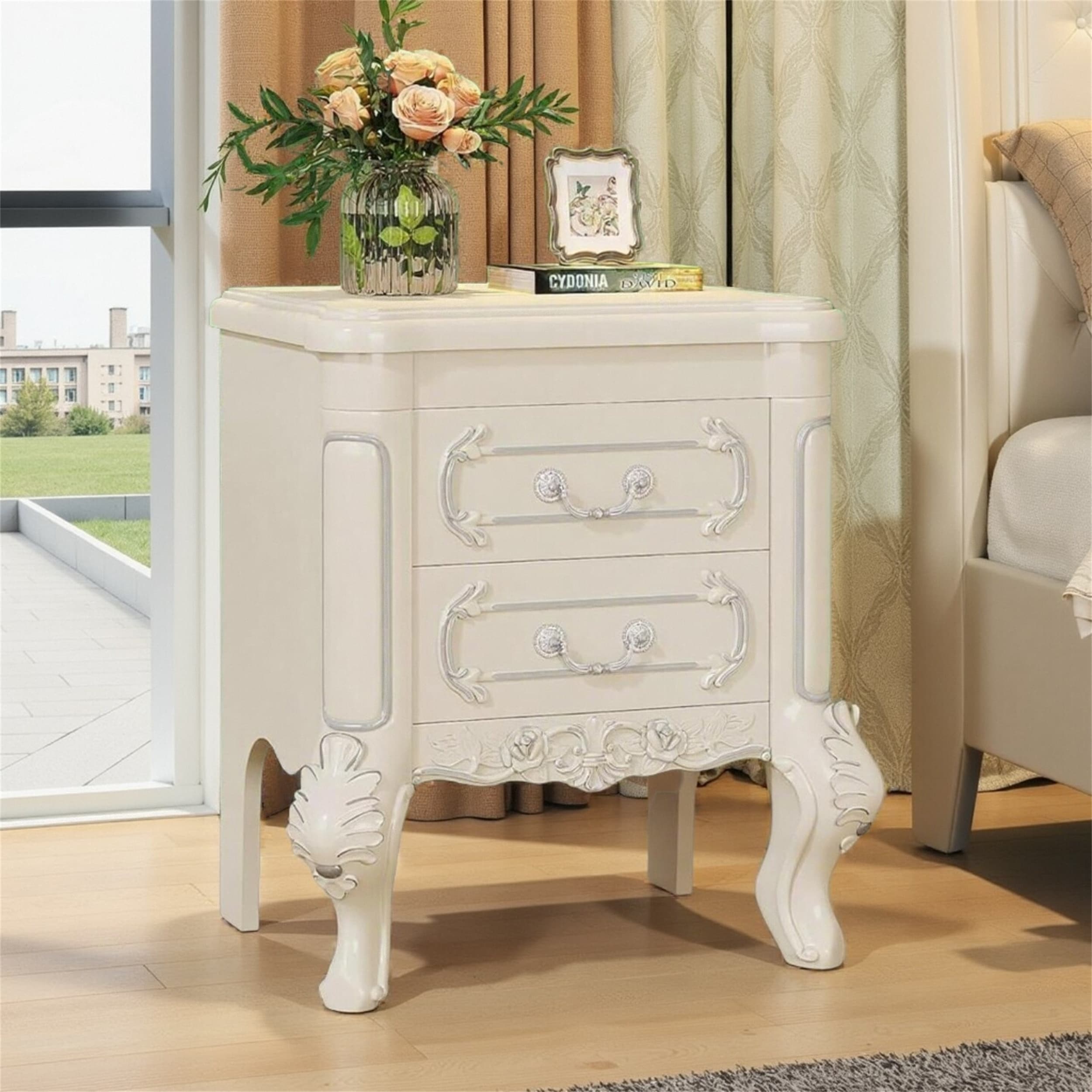 White Nightstand with Carved Patterns, 2-Drawer Storage,Silver Accents