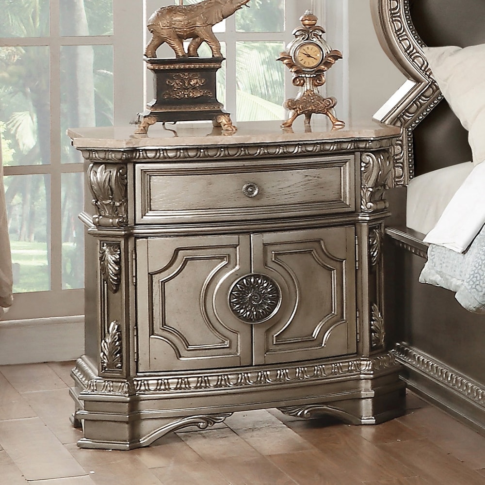 1 drawer and 2 wooden doors nightstand with marble top, antique silver