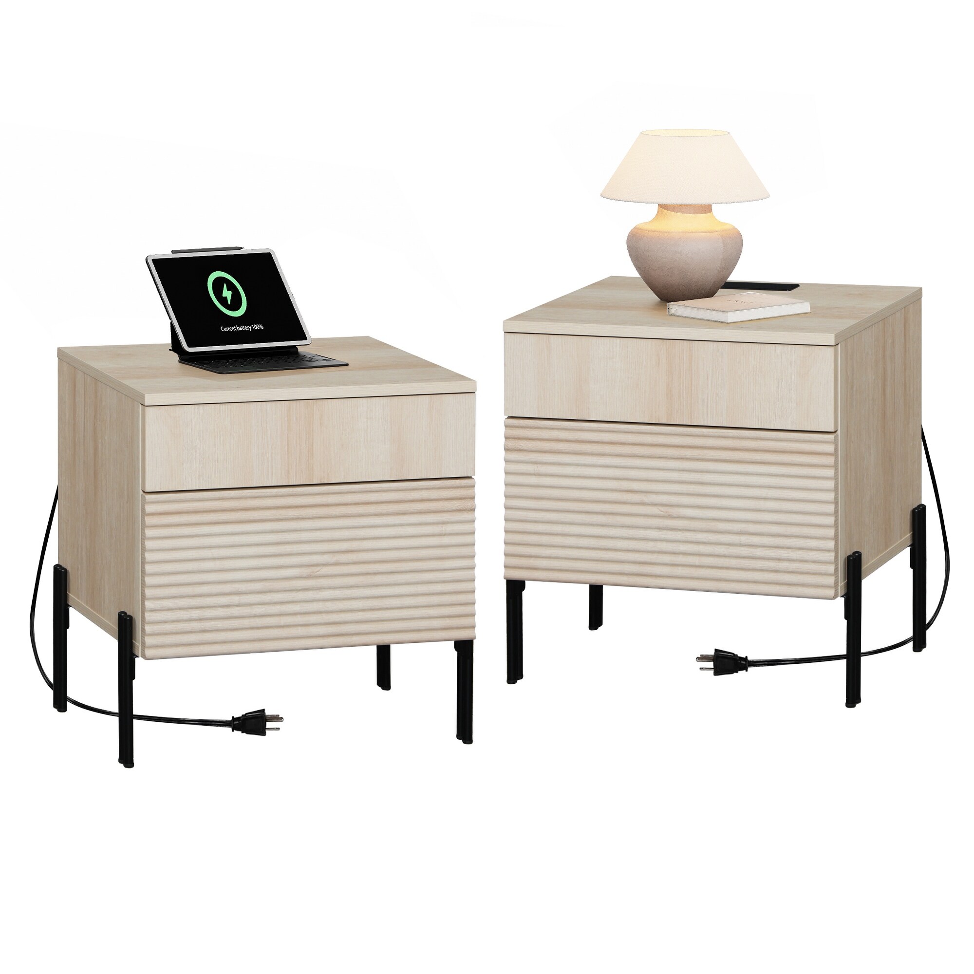 WAMPAT Fluted Nightstand with Charging Station,Modern Side Table with 2 Drawers