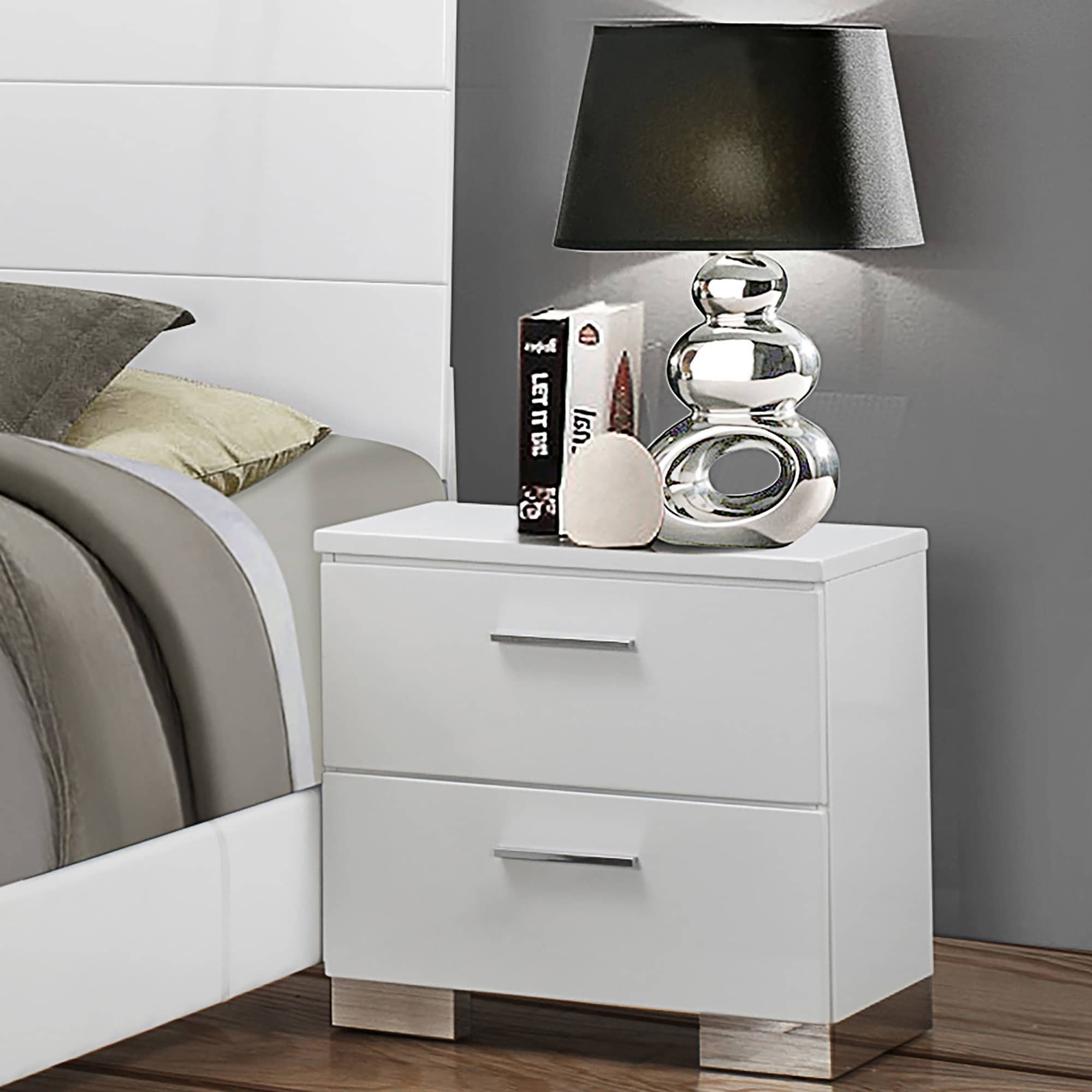 Modern High-Gloss White Nightstand with Chrome Accents - 2-Drawer Compact Storage with Metal Glides