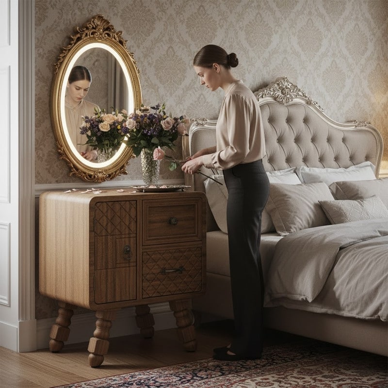 Artisan Furniture Solid Wood Nouveau Nightstand ,oak-beige ,1Drawer