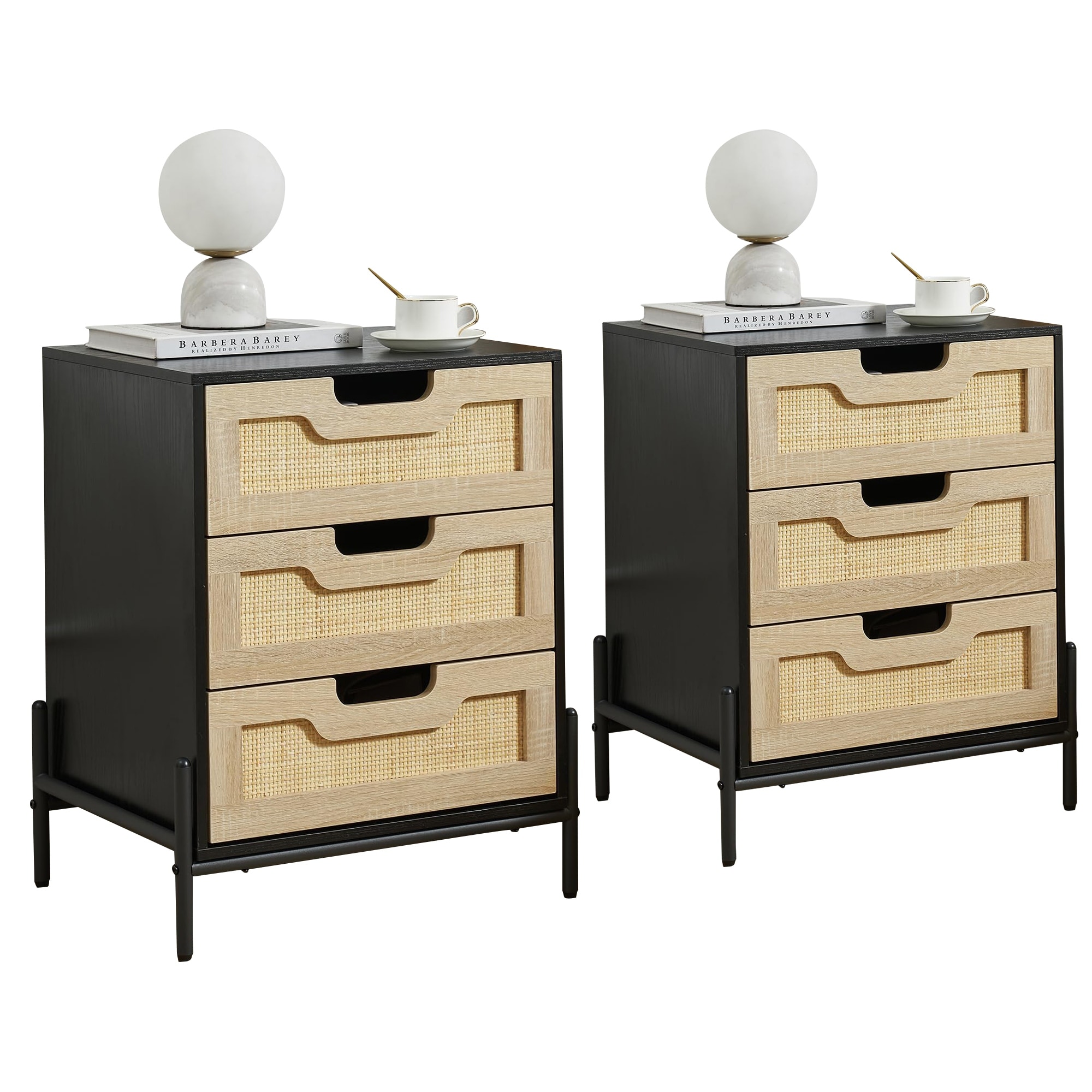 Rattan End Table, Nightstands with 3 Natural Rattan Drawers Set of 1/2