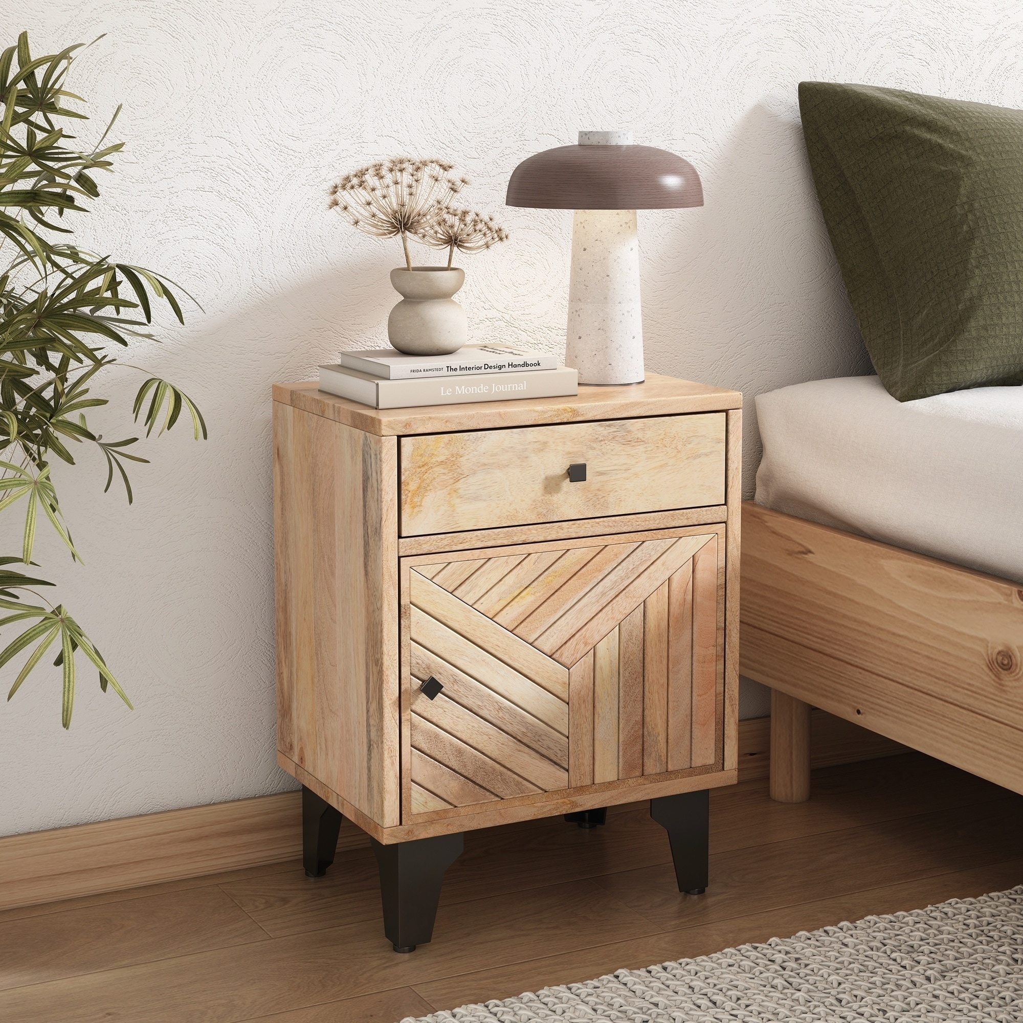 Handcrafted Solid Wood Nightstand with Drawer, Natural Finish and Hand-Carved Design for Bedroom Elegance and Storage