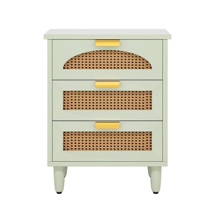 Retro Green 3 Drawer Nightstand with Rattan Accents and Gold Handles Modern Farmhouse Style
