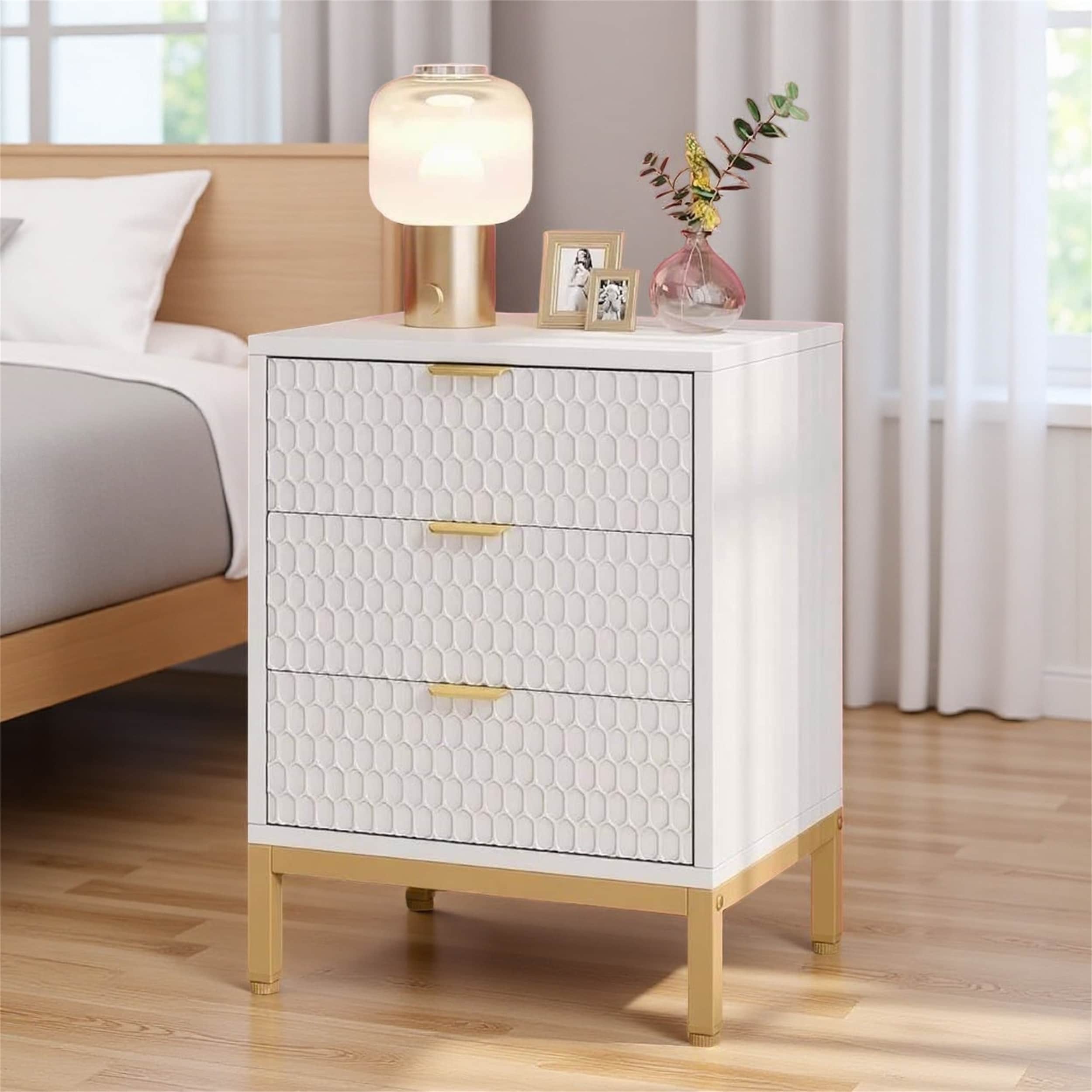 Modern Nightstand with 3 Drawers, Gold Metal Base, Adjustable Feet