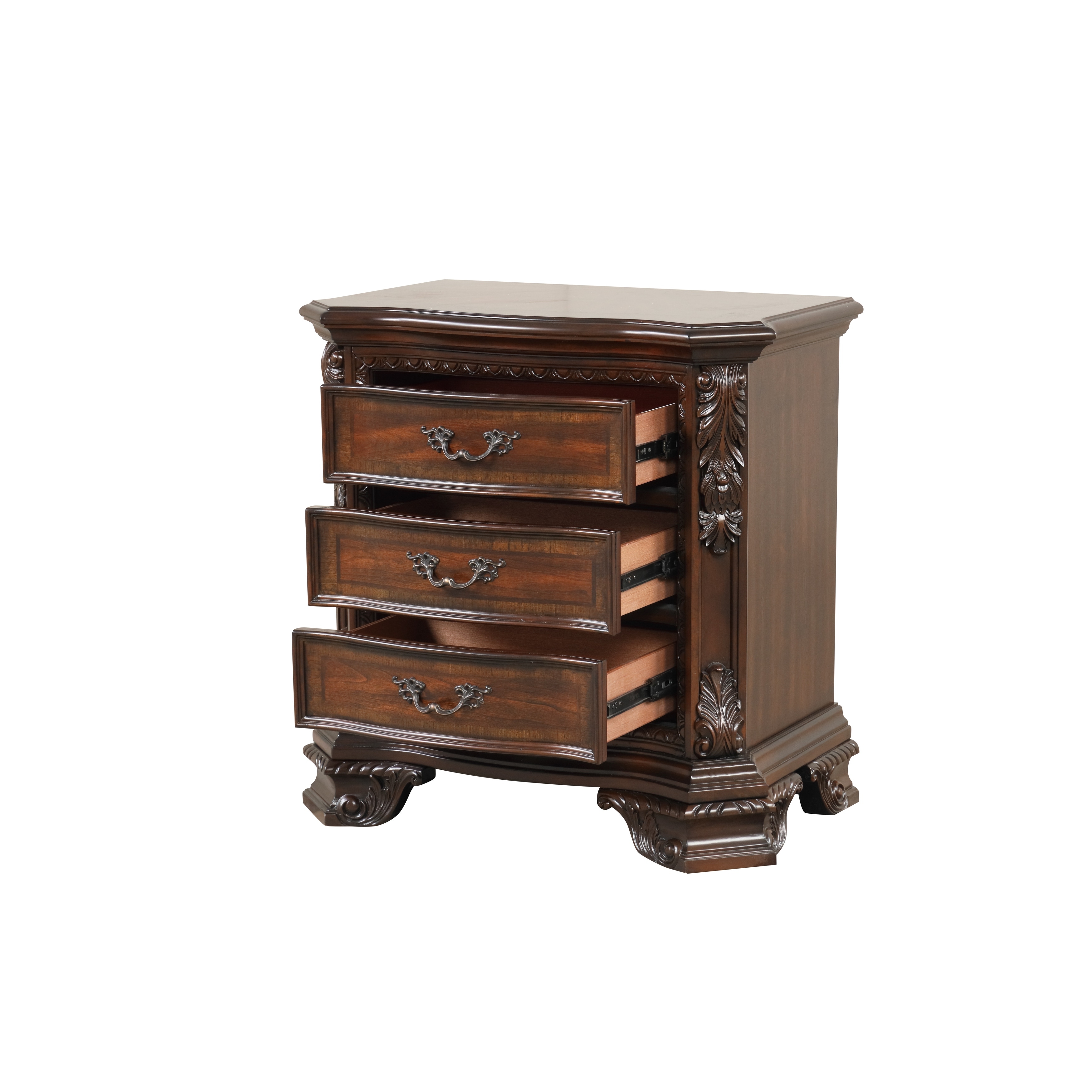 traditional style 3-drawer night stand with metal drawer pulls made with wood in walnut