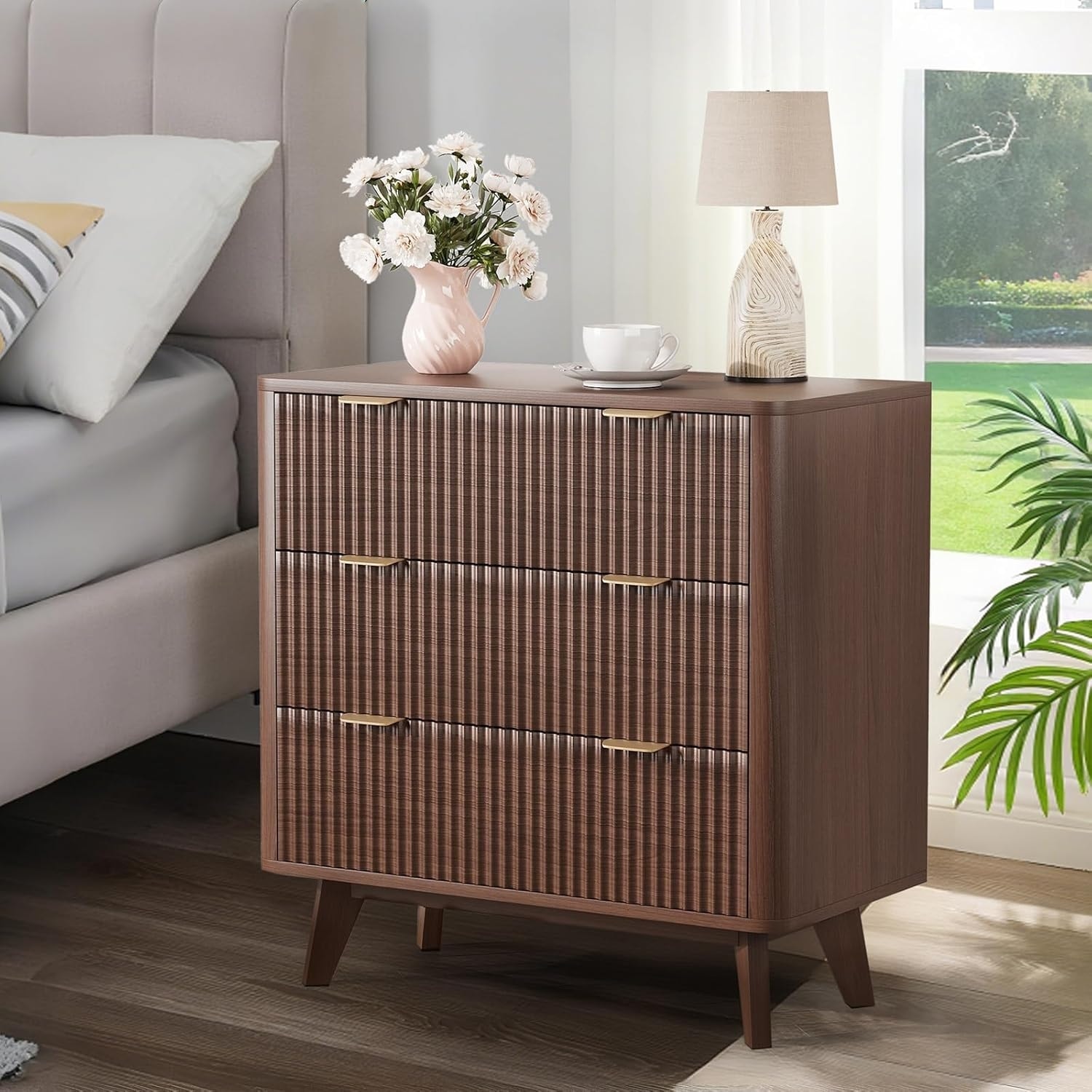 32" Fluted Nightstand, Modern 3 Drawer Bedside Table with Faux Marble Top