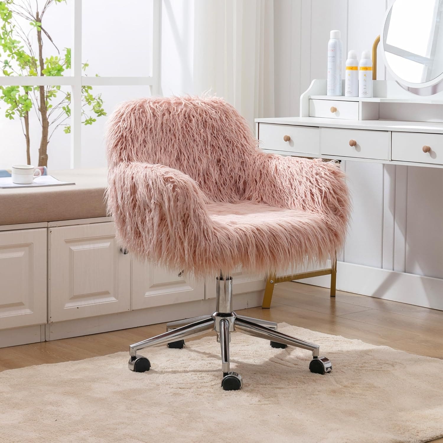 Pink Faux Fur Office Chair with Wheels, Adjustable Swivel Vanity Chair for Women, Soft Ergonomic Desk Chair for Bedroom Study
