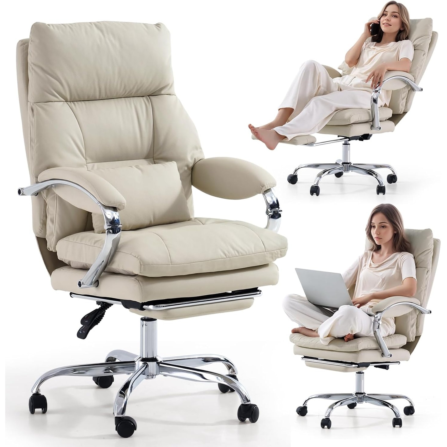 Ergonomic Reclining Office Chair with Footrest, Adjustable Lumbar Support & PU Leather, 300lbs Capacity - Cream