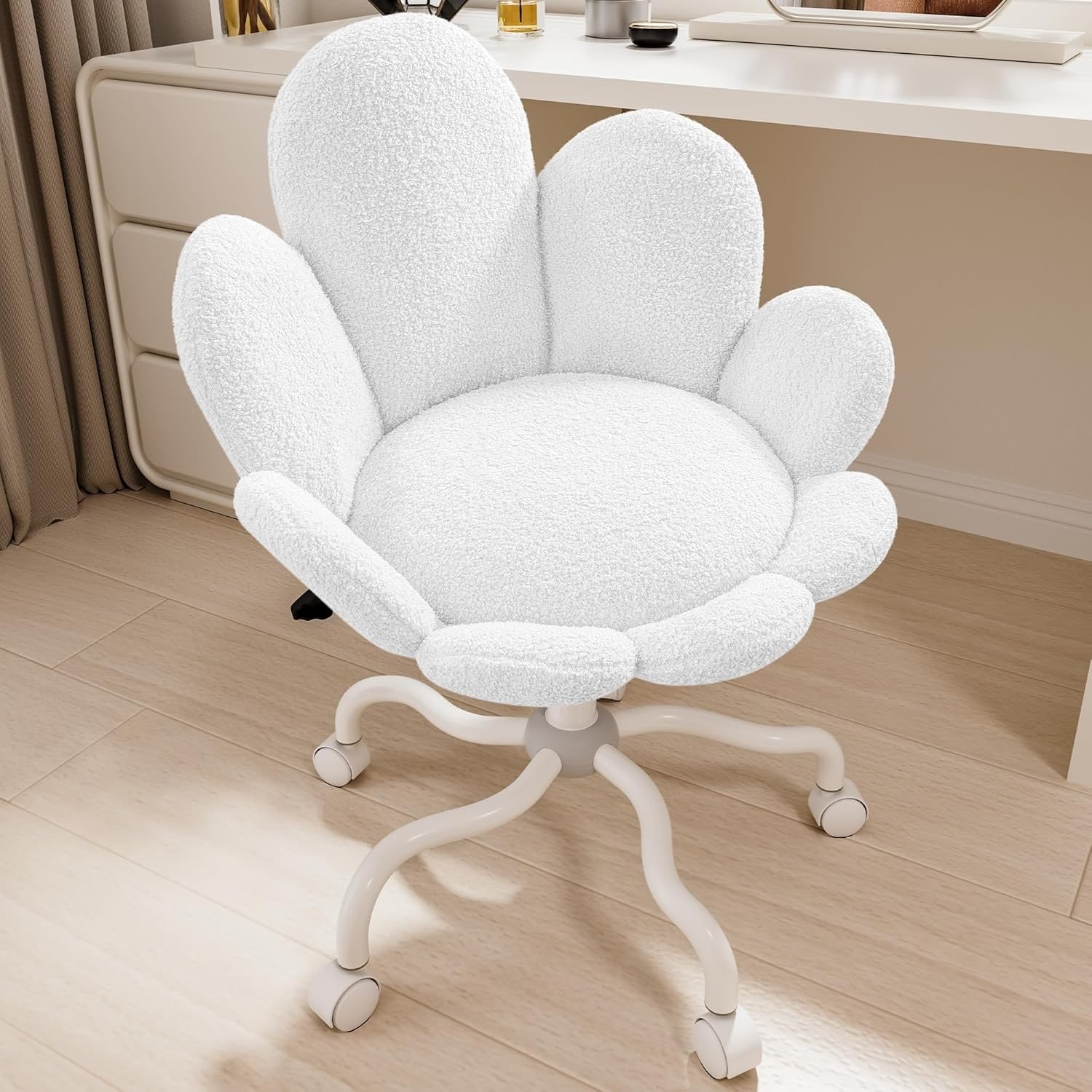 White Swivel Vanity Chair with Adjustable Height and Rolling Wheels, Plush Upholstered Design for Girls Makeup and Relaxation