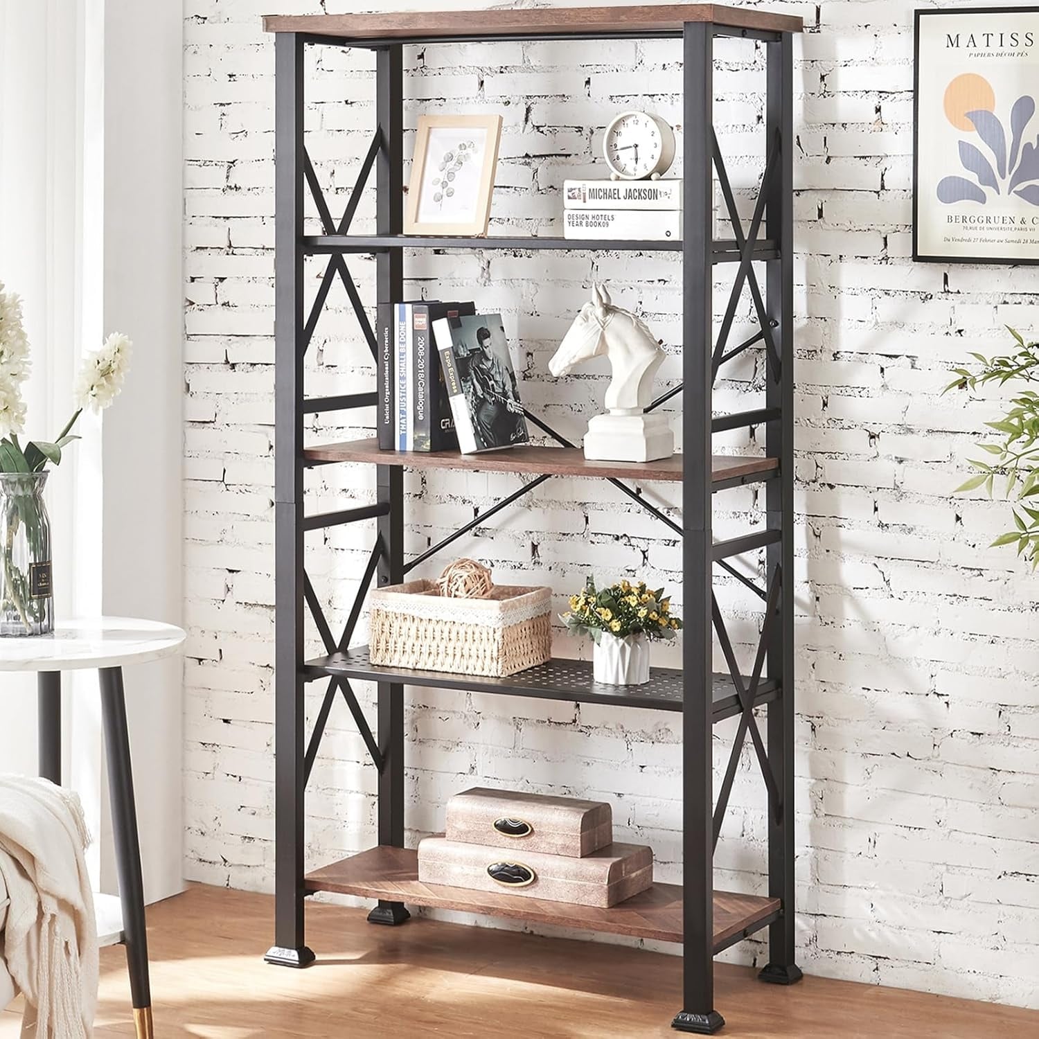 5-Tier Tall Bookshelf with Metal Frame and Open Shelves, Rustic Design for Living Room, Bedroom, and Home Office, Brown