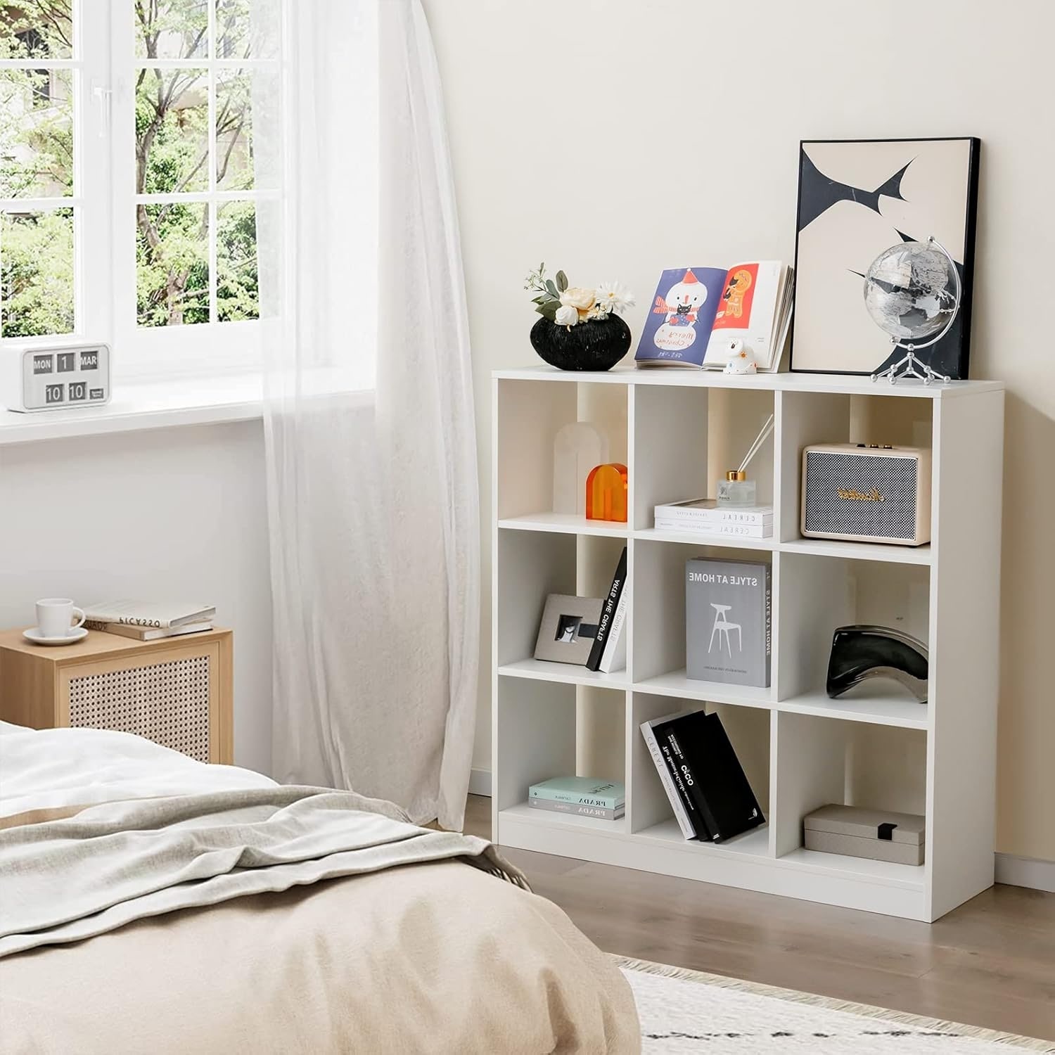 Modern 4-Tier 9-Cube Bookcase with Anti-Tipping Kit, White Freestanding Open Bookshelf for Living Room, Bedroom, or Kid's Room