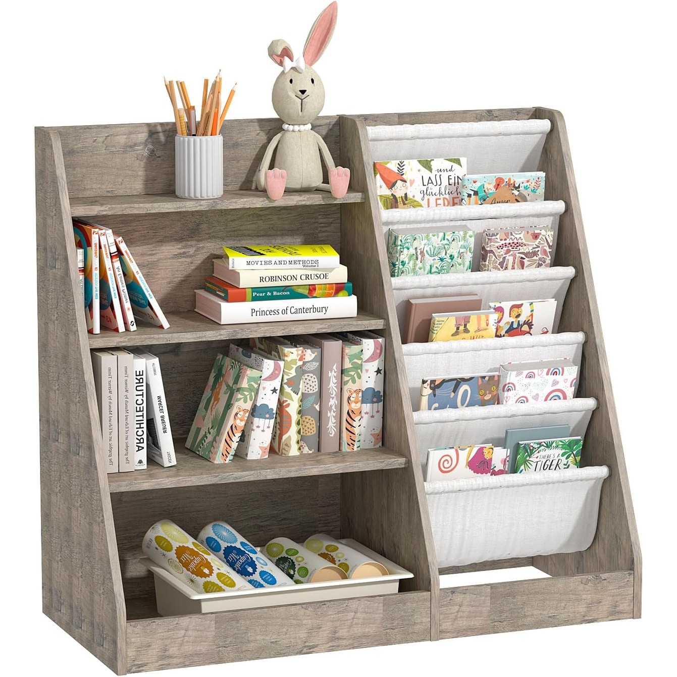4 Tier Wooden Kids Bookshelf with Storage Sling Pockets, Toy Organizer for Nursery, Playroom, Classroom
